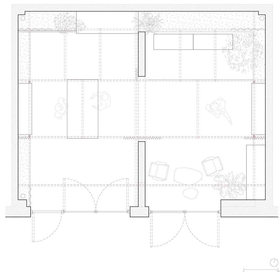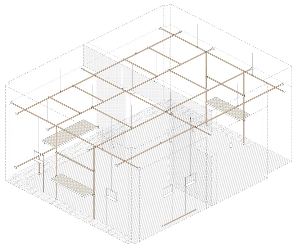 针对原土建的改造动作相对克制,原始天花被放松地裸露出来,仅在两间铺位的分户墙上进行开洞,让人得以在空间内自由穿行,也让视线、光线和外部的景观相互渗透。围绕墙边界铺设石景花木,形成“花园”。在此空间结构的基础上,引入了一套“棚架系统”,构成空间骨架的同时,展示道具和灯具等可以悬挂于其上,也可根据展览和空间使用情况自由调整。
