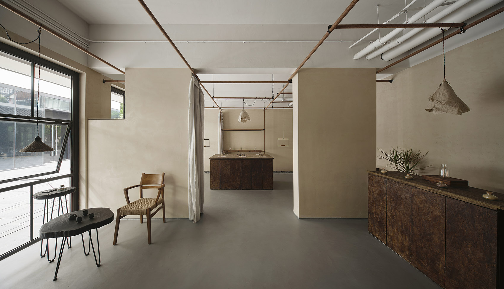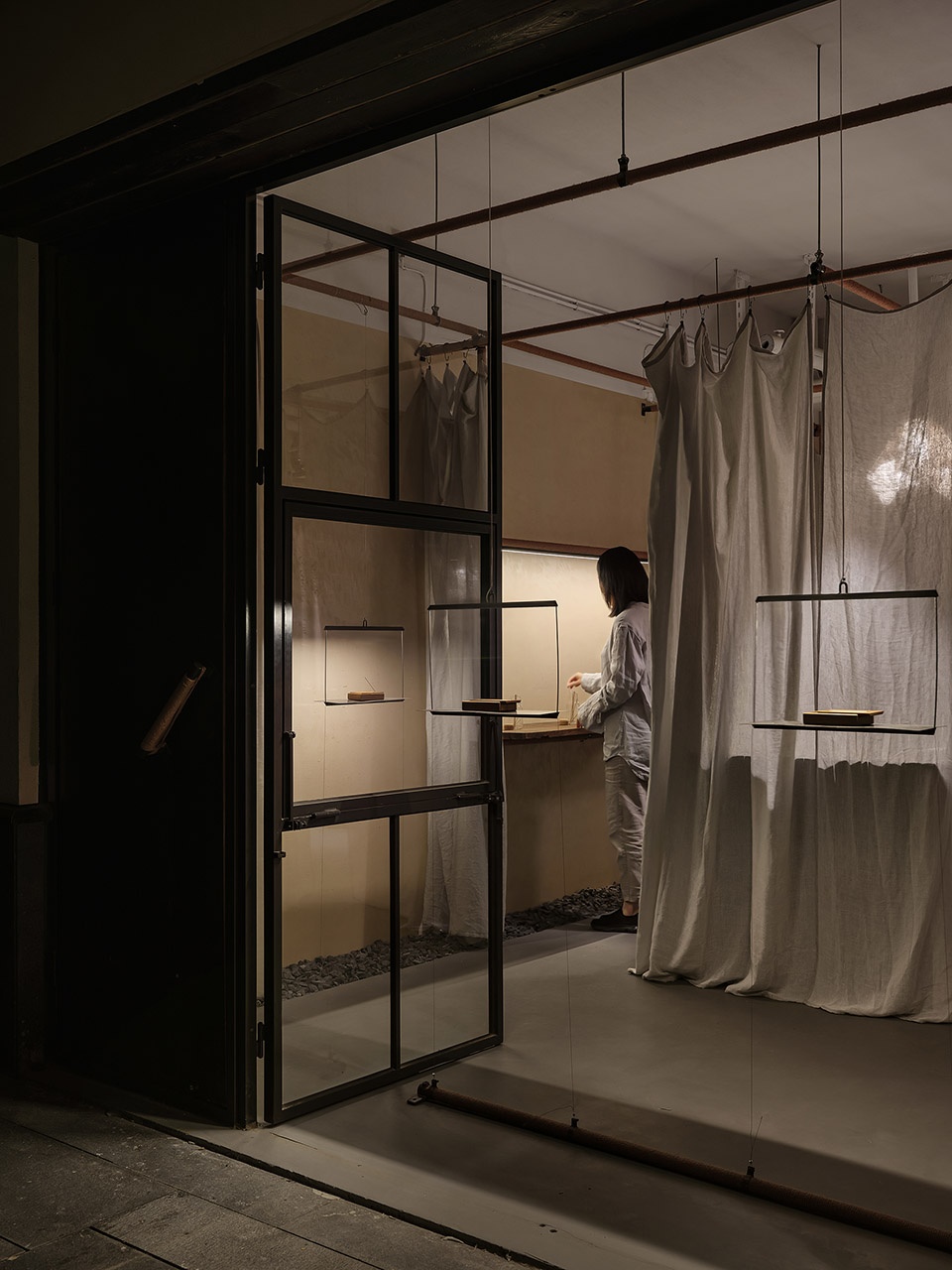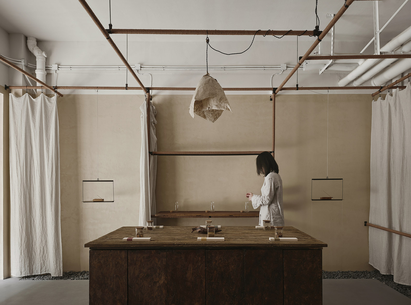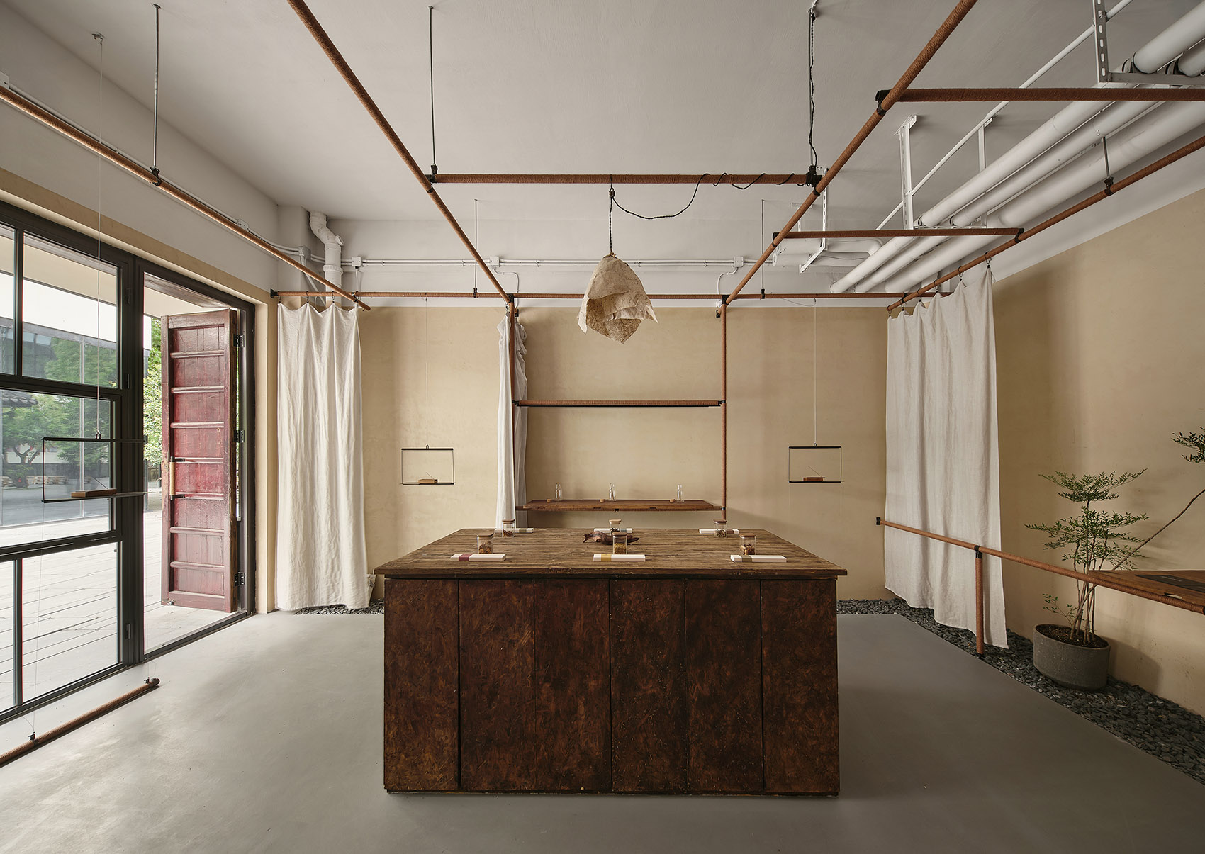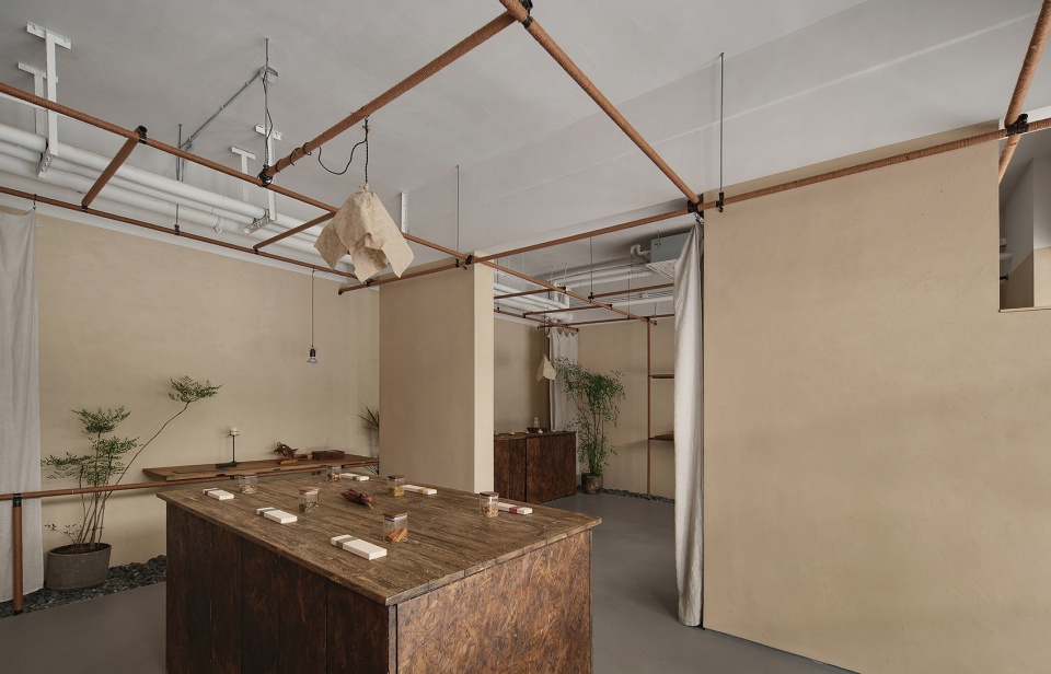 除了展厅所必须的产品陈列区域之外,业主希望设置一处试香室兼茶室,以及可以举办手作活动的工作坊空间。为了构建一个可适应多元功能的空间叙事,我们在棚架上悬挂了的半透帷幔,将日光筛滤成漫射的光晕,同时编织出空间中转瞬即逝的光影变化,呼应着内部不断变化的使用图景。