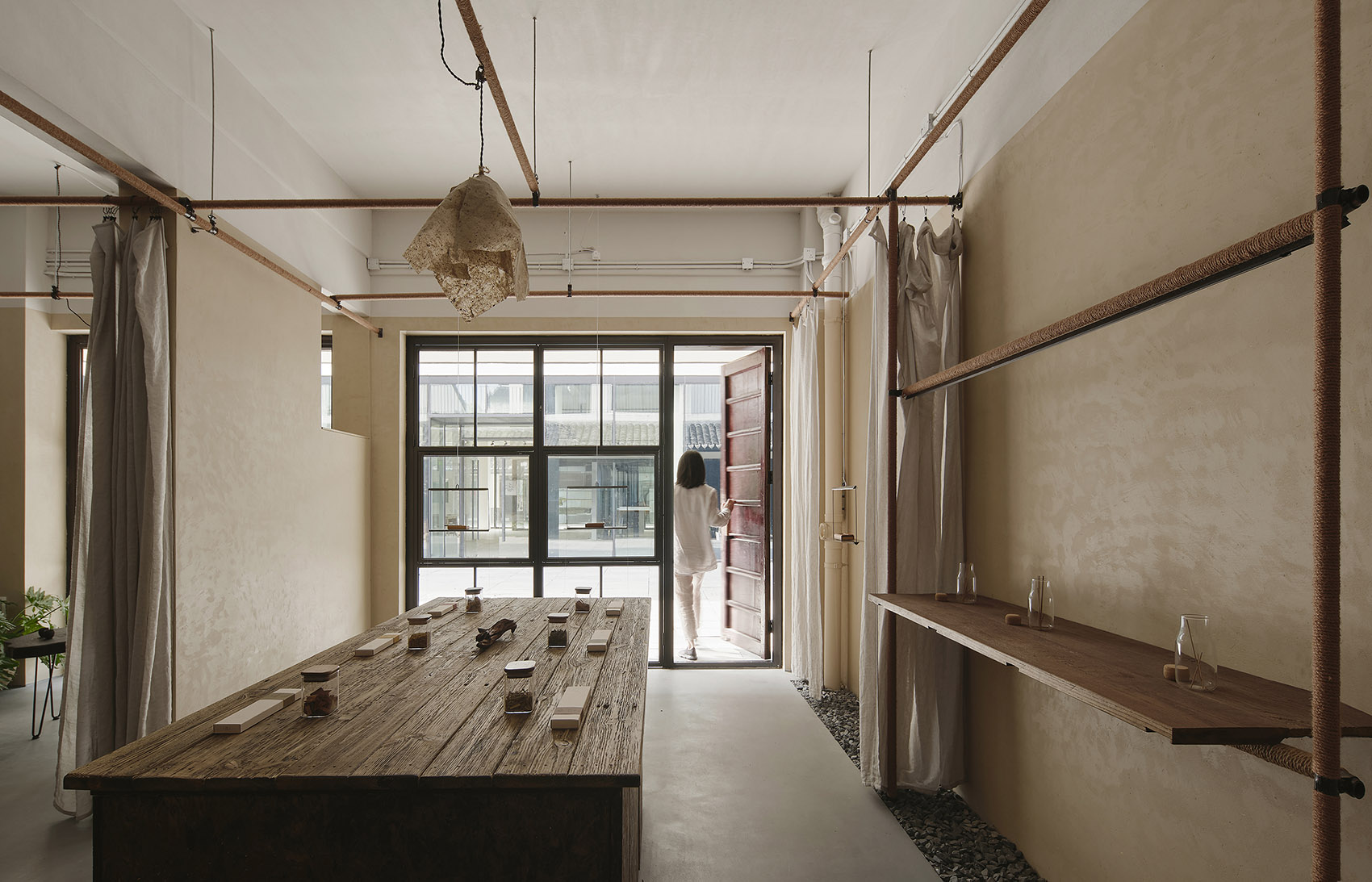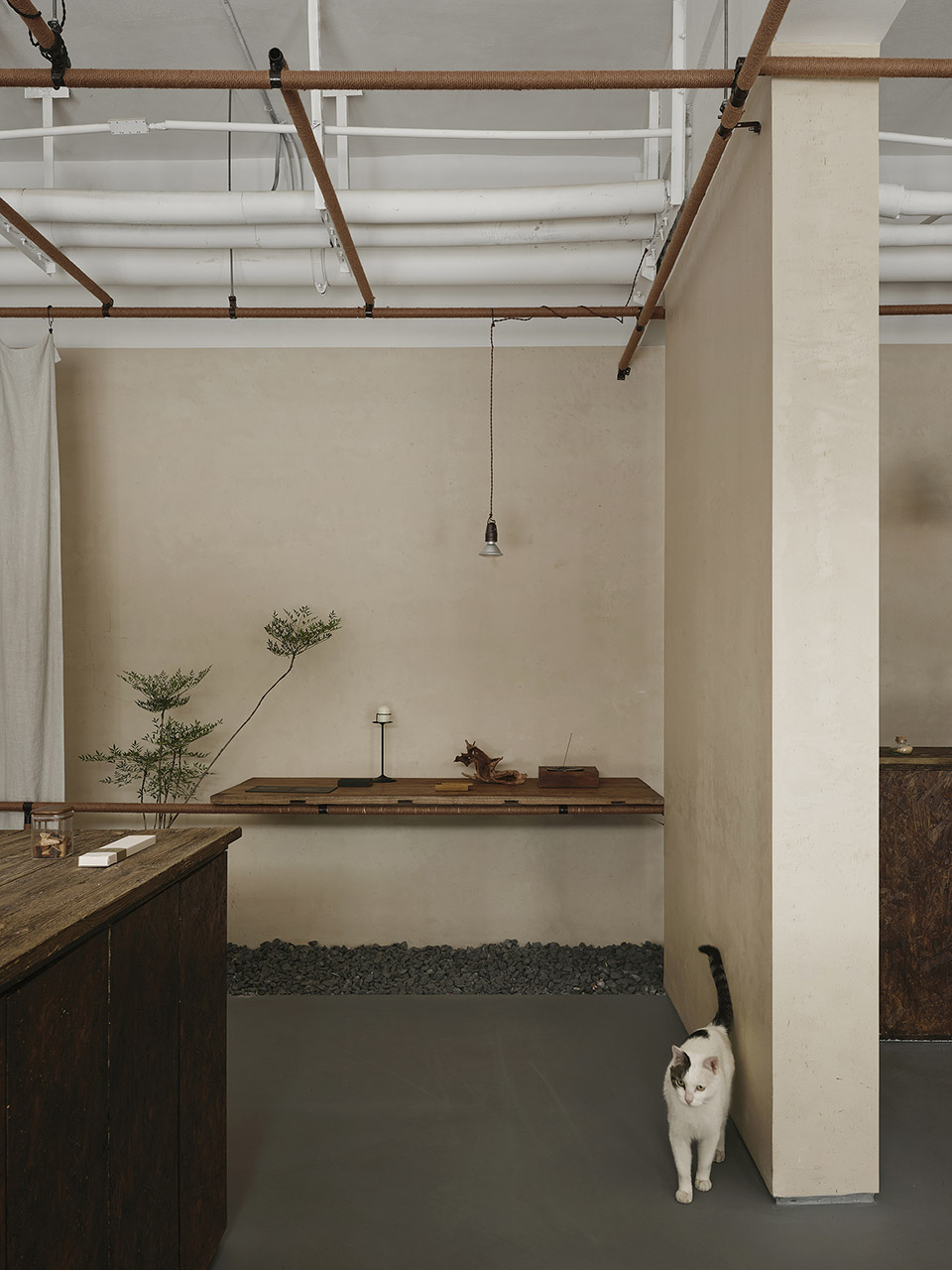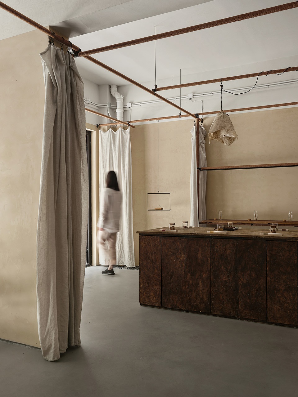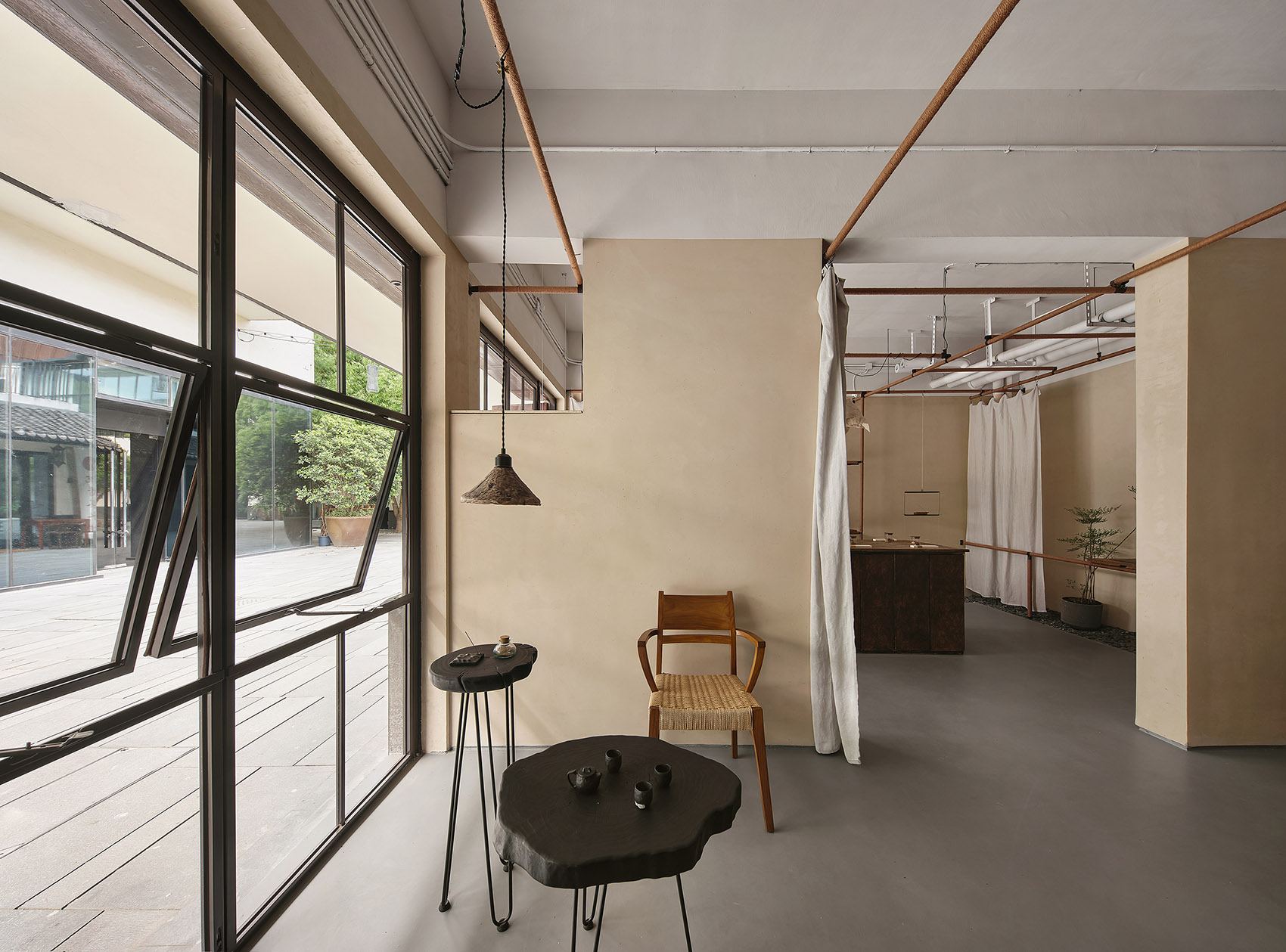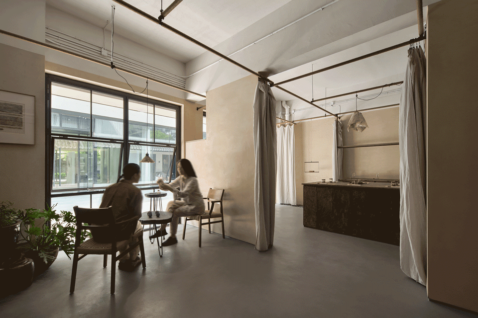 除了展厅所必须的产品陈列区域之外,业主希望设置一处试香室兼茶室,以及可以举办手作活动的工作坊空间。为了构建一个可适应多元功能的空间叙事,我们在棚架上悬挂了的半透帷幔,将日光筛滤成漫射的光晕,同时编织出空间中转瞬即逝的光影变化,呼应着内部不断变化的使用图景。
