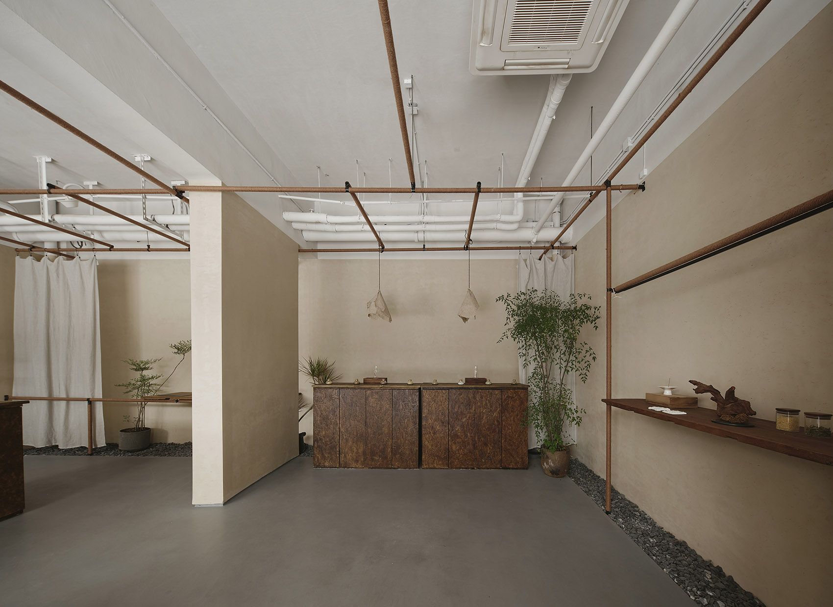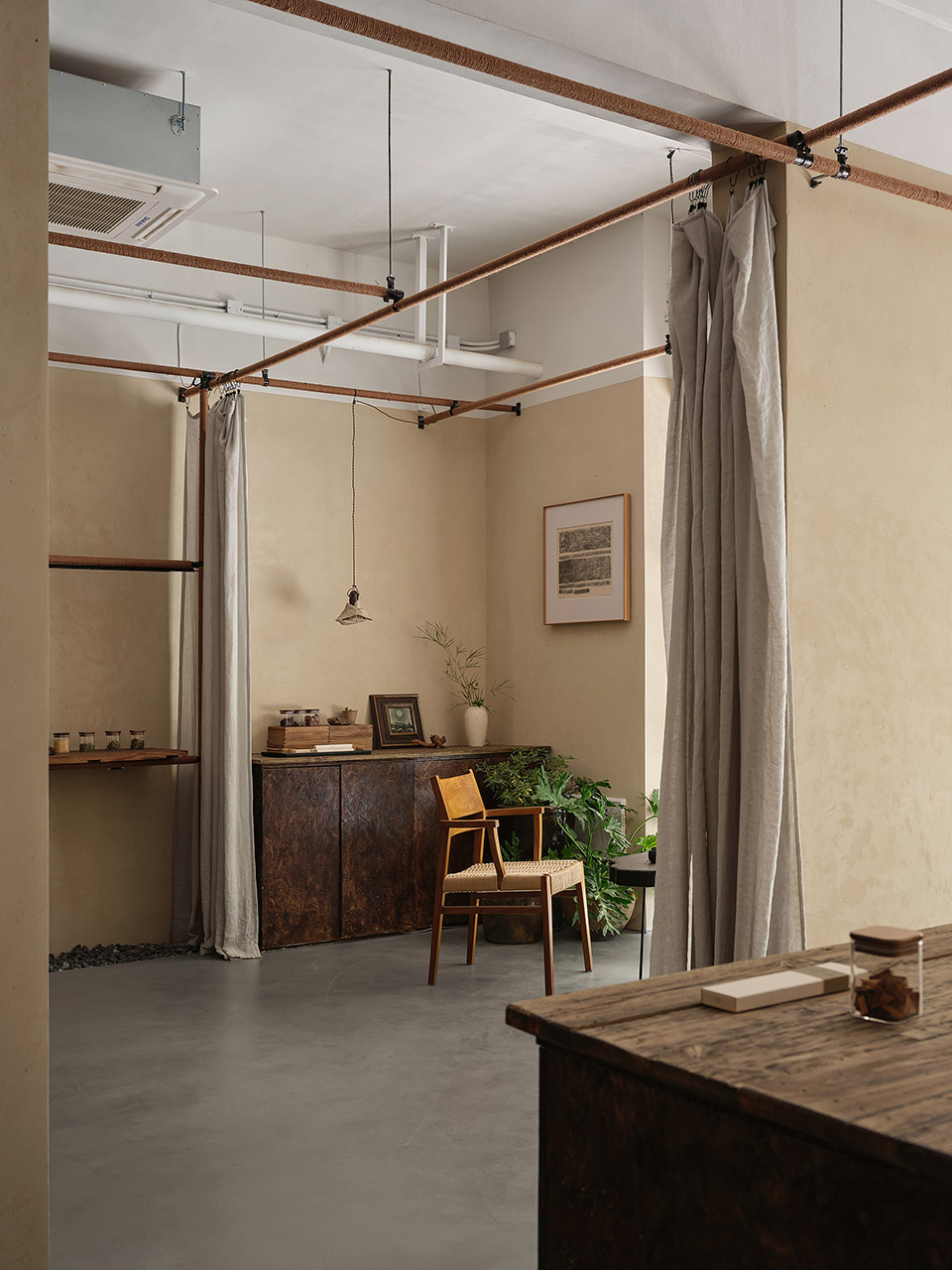In addition to the essential product display area, the client desires the inclusion of a incense testing and tea room, alongside a workshop space suitable for hosting handmade activities. To curate a spatial narrative of adaptive versatility, we’ve suspended semi-translucent draperies from the pergola—veils that sieve daylight into diffused glows while weaving ephemeral partitions, responsive to the ever-shifting tapestry of use within.