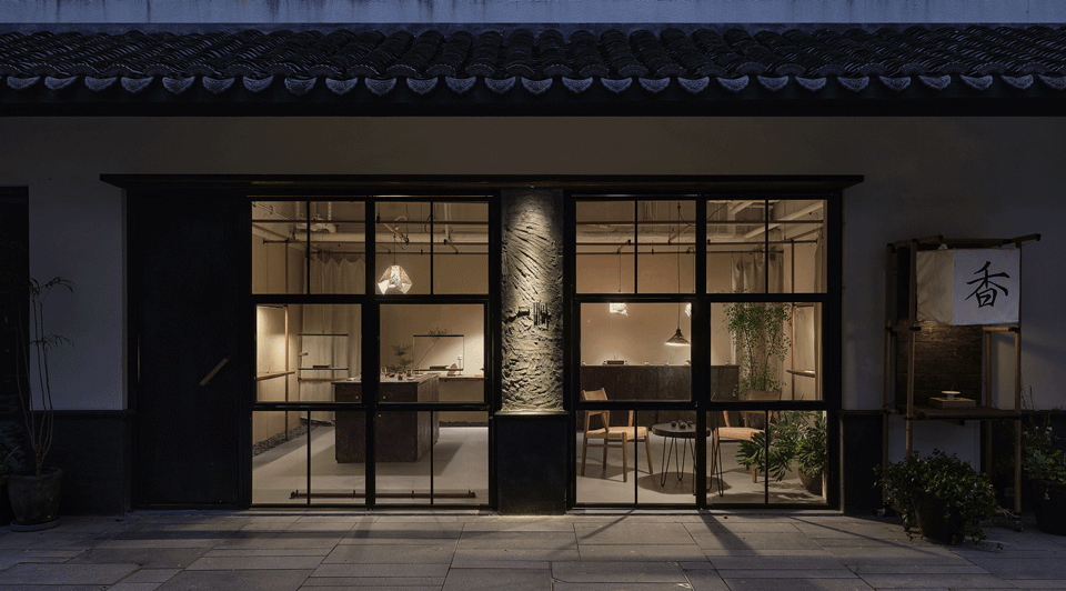 场地位于西塘古镇附近的良壤酒店艺术街区,此处汇集了诸多器物店、手工艺商店等,我们的业主受邀进驻街区内一座仿古建筑首层的两开间铺位,开设他们的第一家线下展厅。业主的线香品牌取名“一晌”,令人联想到映照在墙面上的婆娑树影。几经讨论,我们决定以“香气的花园”作为意象,试图通过展厅空间向来访者传递这种浪漫而又转瞬即逝的氛围。