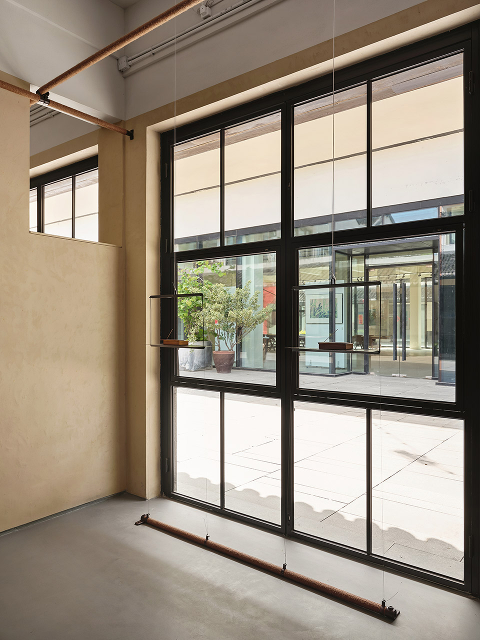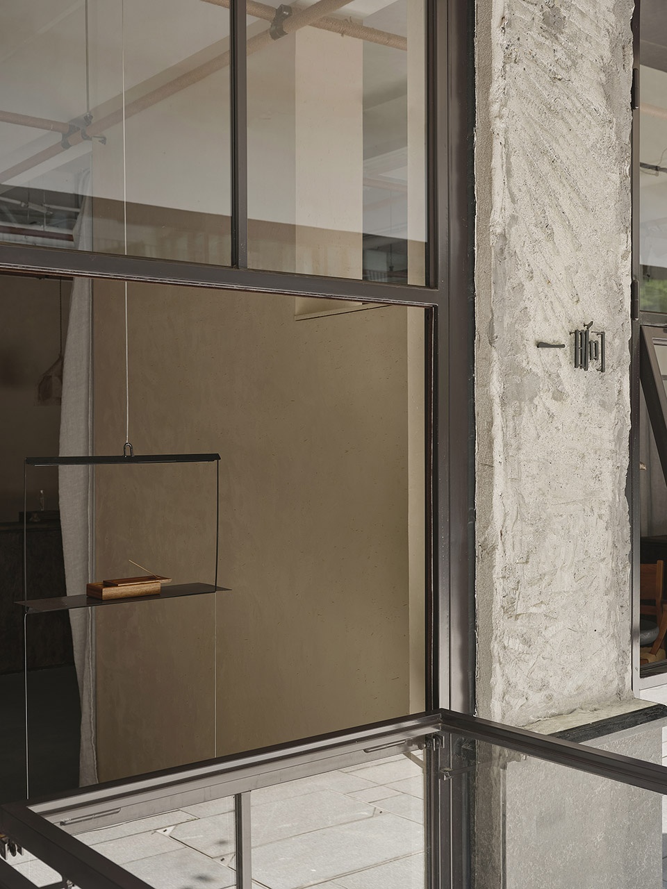 The renovation of the original building structure is relatively restrained. The original ceiling is simply exposed, and only openings are made on the partition wall between the two spaces, allowing people to stroll freely in the space and enabling the mutual penetration of sight, light, and external landscapes. Stone scenery and plants have been arranged around the perimeter of the walls, creating a “garden”. On the basis of this spatial structure, a “pergola” is introduced, which not only forms the spatial skeleton but also allows display props, lighting fixtures, etc., to be hung on it and allows it to be freely adjusted according to the display needs and space utilization.