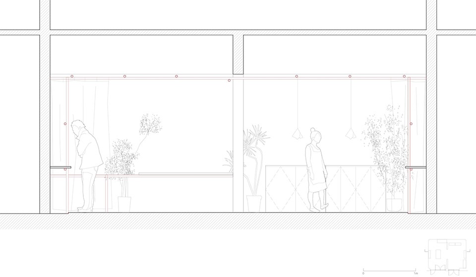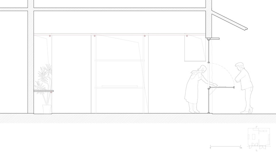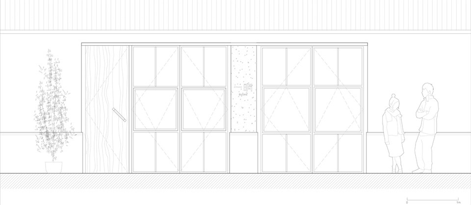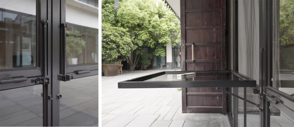 我们在临街的边界设计了一套“瞬变”的门窗系统:当门窗扇全部关闭时,呈现出一种谦逊而又与周边街区相协调的传统意蕴;而当门窗扇以精心设计的各种模式开合变化时,又意外地瞬变为橱窗、展台、茶桌等多种互动态。