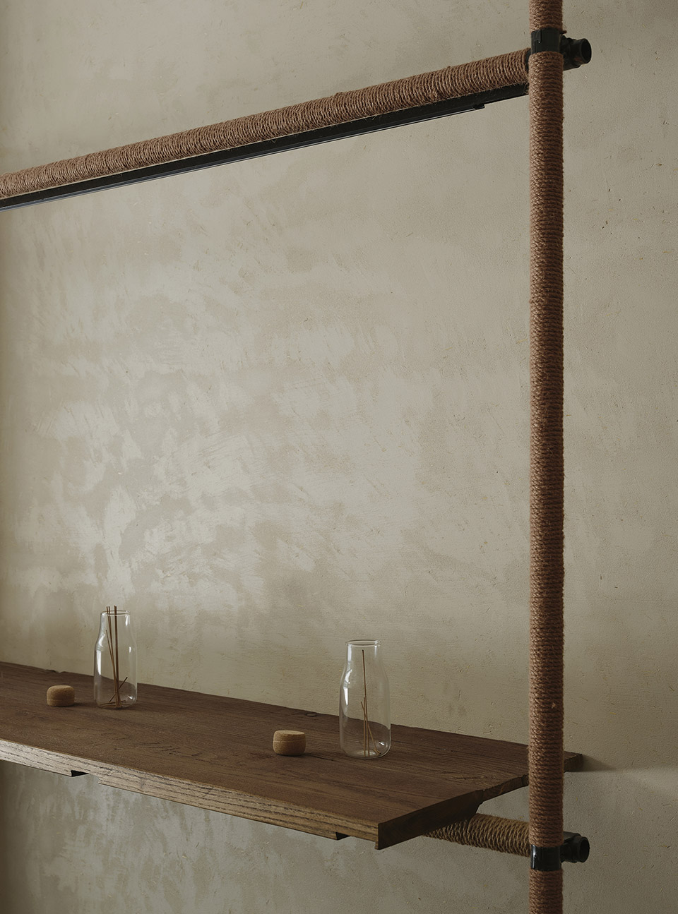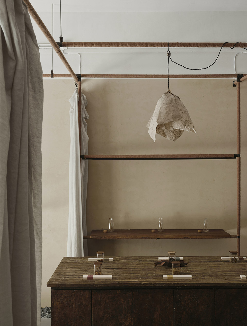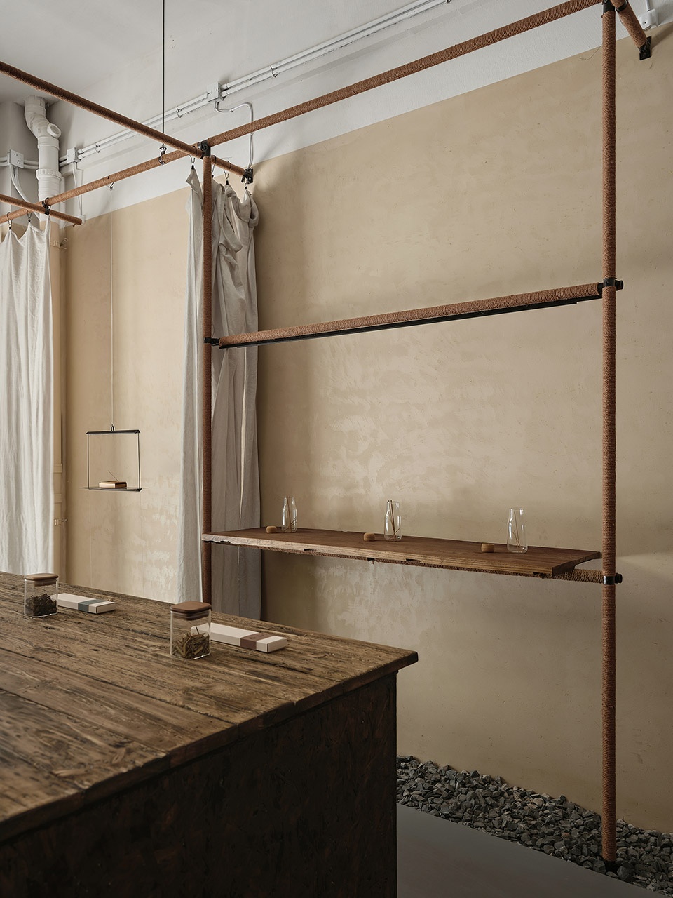 我们选取本地回收的多种旧木板与门扇作为展台和其他木作的材料,并与代表了工业化体系的欧松板混用,表面施以多道木蜡油,最终手工打磨成一种粗粝而优雅的统一质感,以衬托线香产品和香器的精致感。