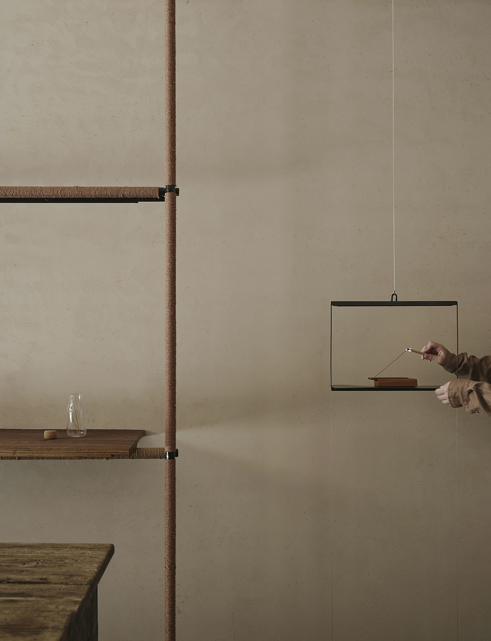“棚架”由成熟的工业化标准产品——线棒(Wire rod)及其成品连接件搭建而成,在线棒表面用手工缠绕麻绳,赋予材料一种近似于线香的质感、色泽和形态,也使得工业化材料与手工艺相融合。由于线棒具有一定弹性,支撑杆与天花拉杆之间形成了微妙的平衡态,如同线香笔挺而又易碎的物质状态。意义(sens)被附着于被挪用(appropriate)的“现成品”(readymade)之上,而最终由建造与材料的互文(intertextuality)得以完整浮现。