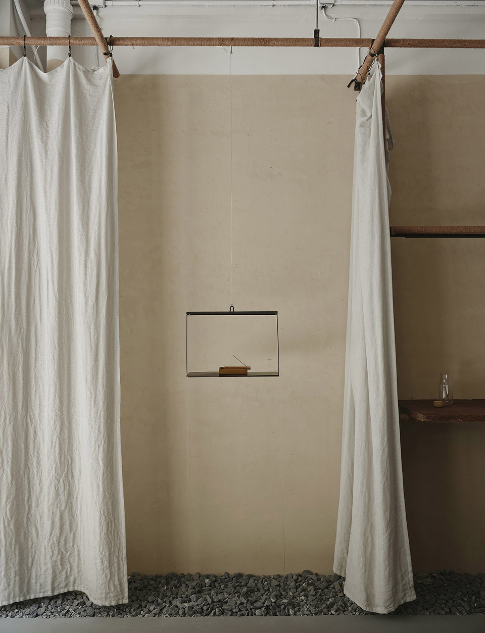 The “pergola” is constructed from mature industrial standard wire rods and their prefabricated connectors. Hemp ropes are hand-wound around the wire rods, imbuing the material with a texture, hue, and form akin to incense sticks—an integration of industrial materials with artisanal craftsmanship. The inherent elasticity of the wire rods creates a delicate equilibrium between support rods and ceiling tie rods, evoking the upright yet fragile physicality of incense. Meaning (sens) adheres to the appropriated “readymades,” fully emerging through the intertextuality of construction and materials.