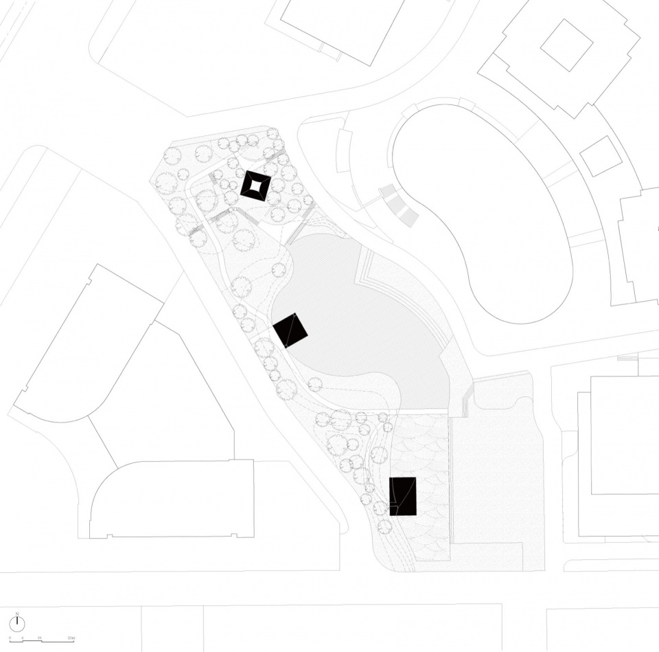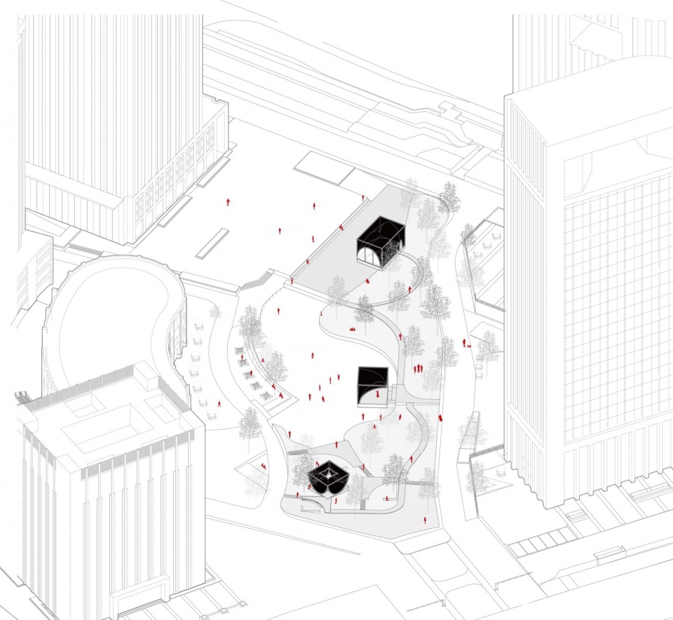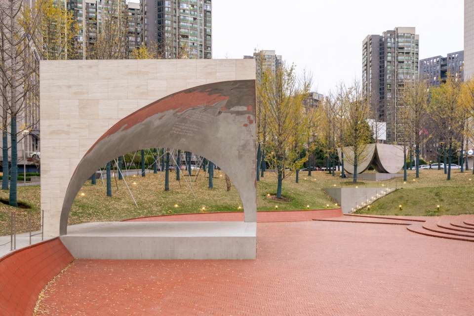 随时间发展变化,周边景观不断生长:银杏林在四季里呈现不同的色彩变化,将配合三座雕塑体中的不同场景一同演奏出丰富变幻的奏鸣曲。