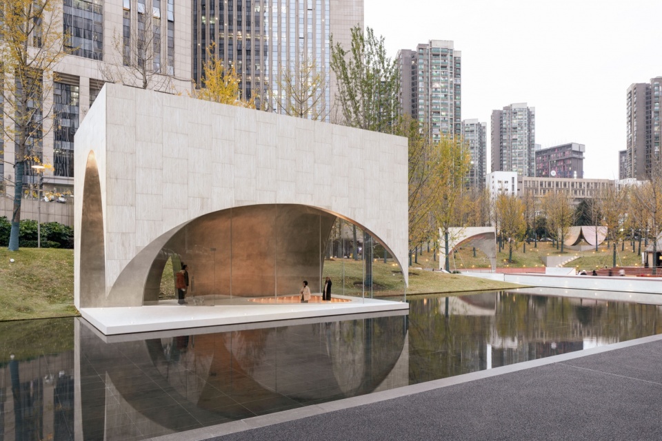 As the seasons change, the landscape evolves: the ginkgo forest cycles through vibrant tones of green, gold, and amber shades, harmonizing with the three pavilions to create an ever-changing, immersive symphony of nature and architecture.
