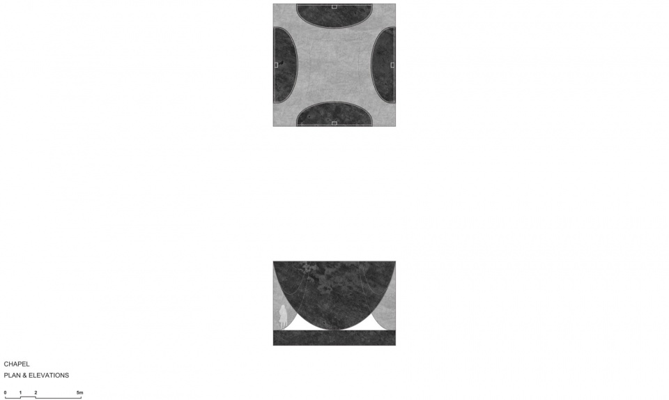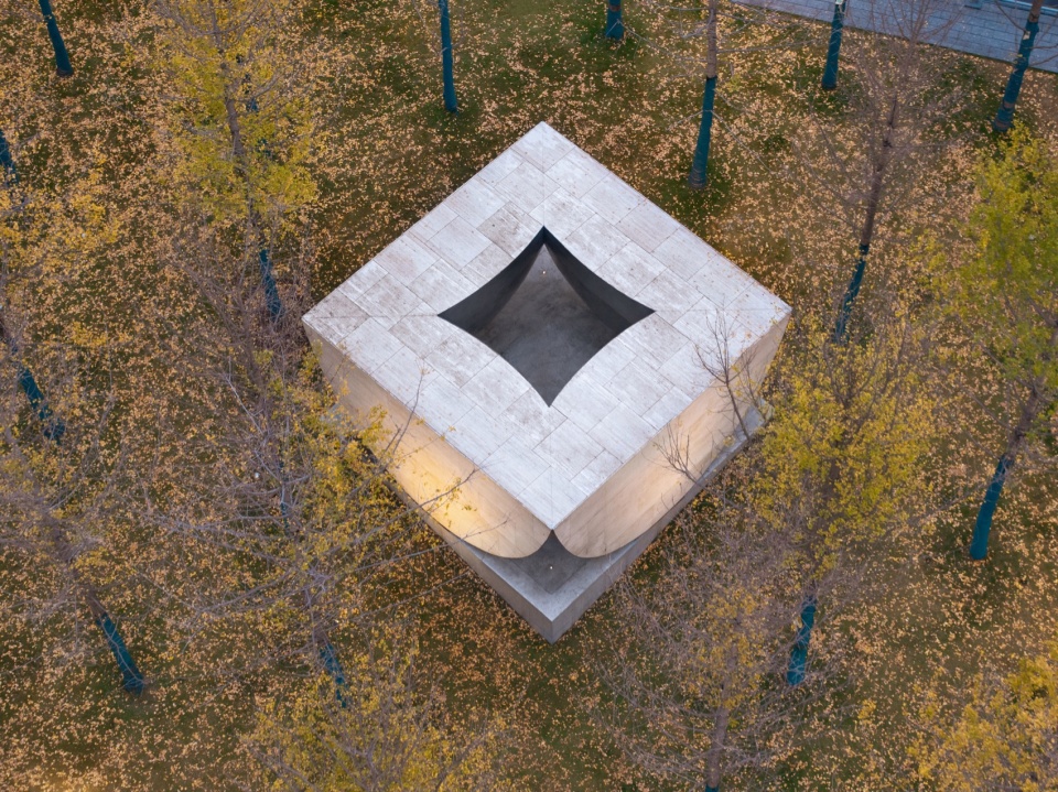 山坡上银杏林中的礼堂则以银杏般的四片巨叶支撑起中央的“空”,当穿越过四片弧形金属球面对峙形成的峡谷缝隙后,人们将在这里仰头观望天空,迎接变幻莫测的天光,倾听银杏枝叶与风的对谈。