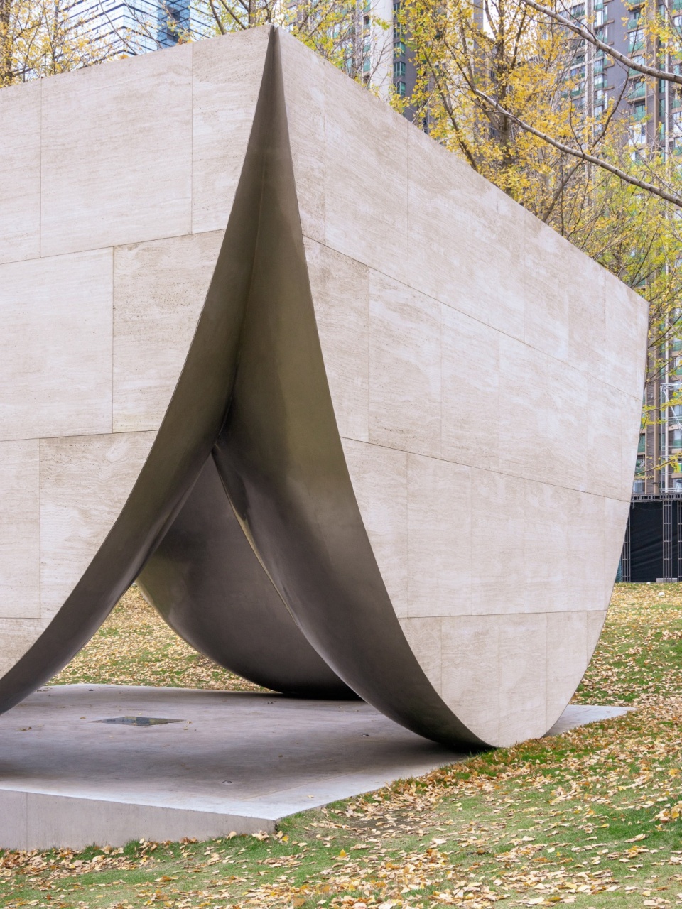 The Ginkgo Chapel, nestled among the trees on the hillside, is held aloft by four massive, ginkgo-inspired stone leaves. As visitors pass through the narrow gap between the curved metallic spheres, they step into the central “void”. Here, one looks upward to greet the shifting light and listens to the soft whispers of the wind as it dances through the ginkgo leaves.