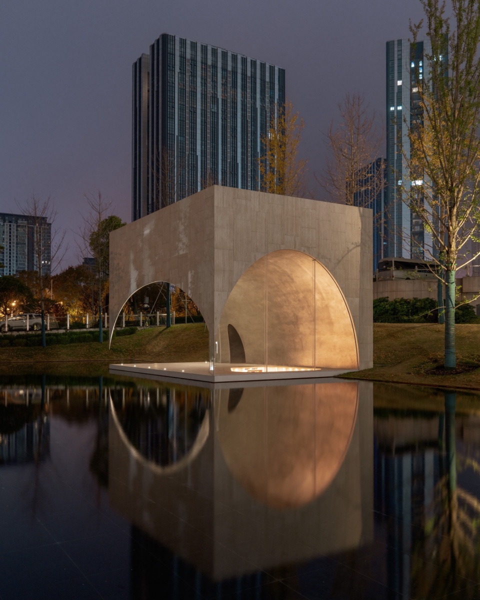 背靠银杏林的缤纷落叶,图书馆(洗马书苑)凭水屹立,方形轮廓内部嵌出一轮金属光泽的拱穹,映射在水中形成随风舞动的婆娑月影。