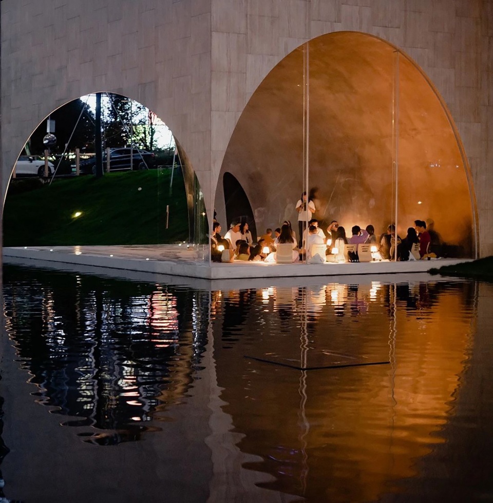 Though serving distinct purposes, the three pavilions share a common language, achieving visual cohesion while responding subtly to their unique functions. The porous architecture invites wind and light to flow freely through the structures. The outer facades are composed of modular panels of porous white travertine, while the inner spheres are assembled from curved stainless-steel plates. In the library and chapel, the inner surfaces are finished with a soft and tactile sandblasted texture, creating a contemplative atmosphere. In contrast, the stage features polished mirror-like steel, reflecting dynamic lights and movements from its surroundings.