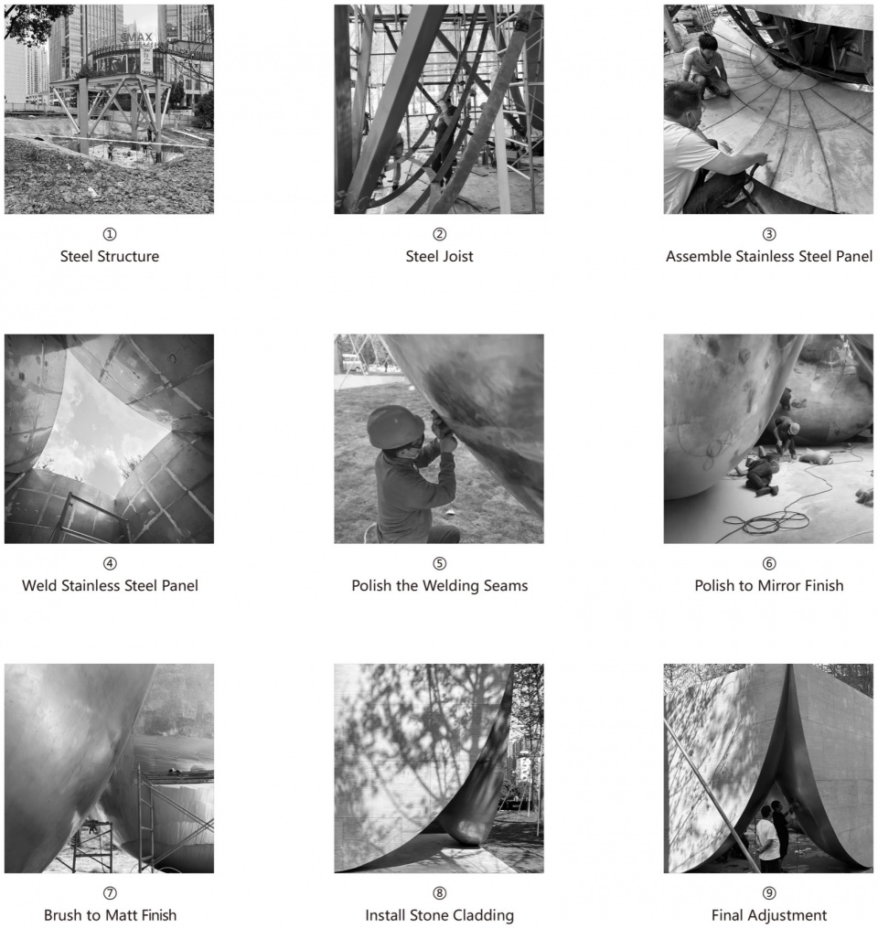 三座雕塑虽功能各异,却共享相似的空间语言,既统一于整体风貌,又因使用场景的不同而展现出微妙差异。多孔的建筑允许风与光线在穿梭流动,而构成建筑的方形外表皮也由多孔的白洞石拼接而成。内侧的球形则由弧形的不锈钢板打磨拼接而成,在图书馆及礼堂呈现温润的磨砂质感,而在戏台以镜面质感反射周围变幻的灯光与动态。