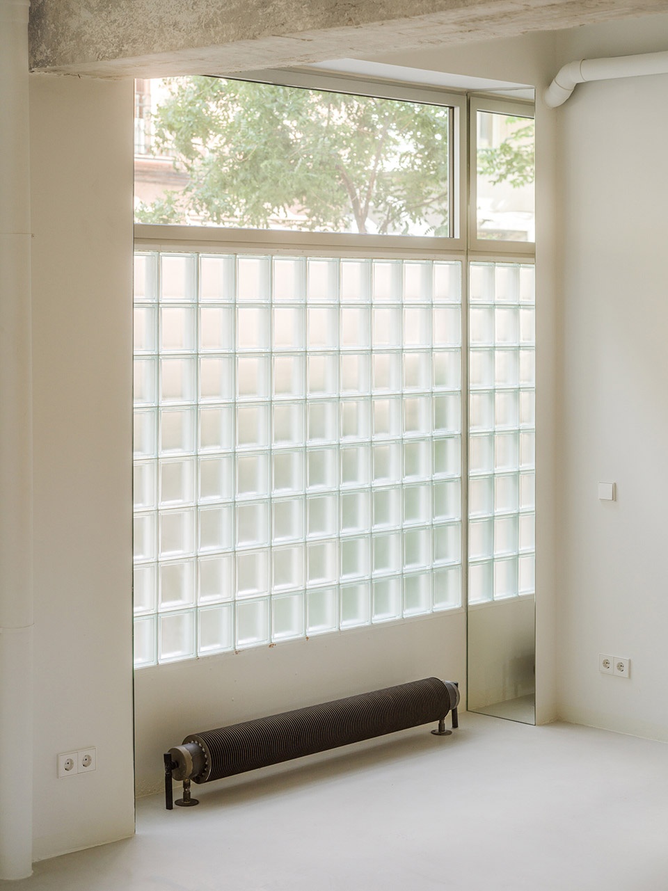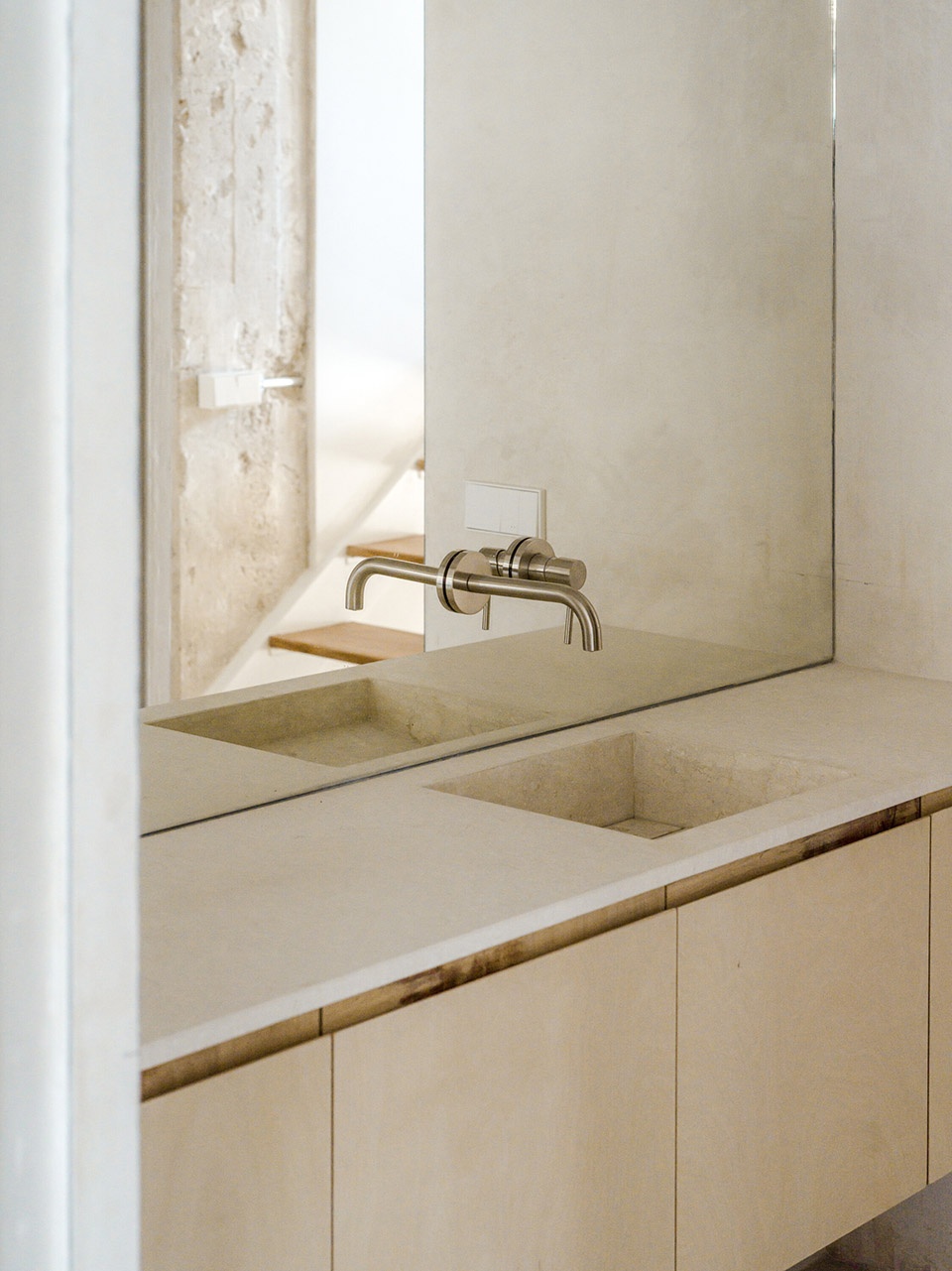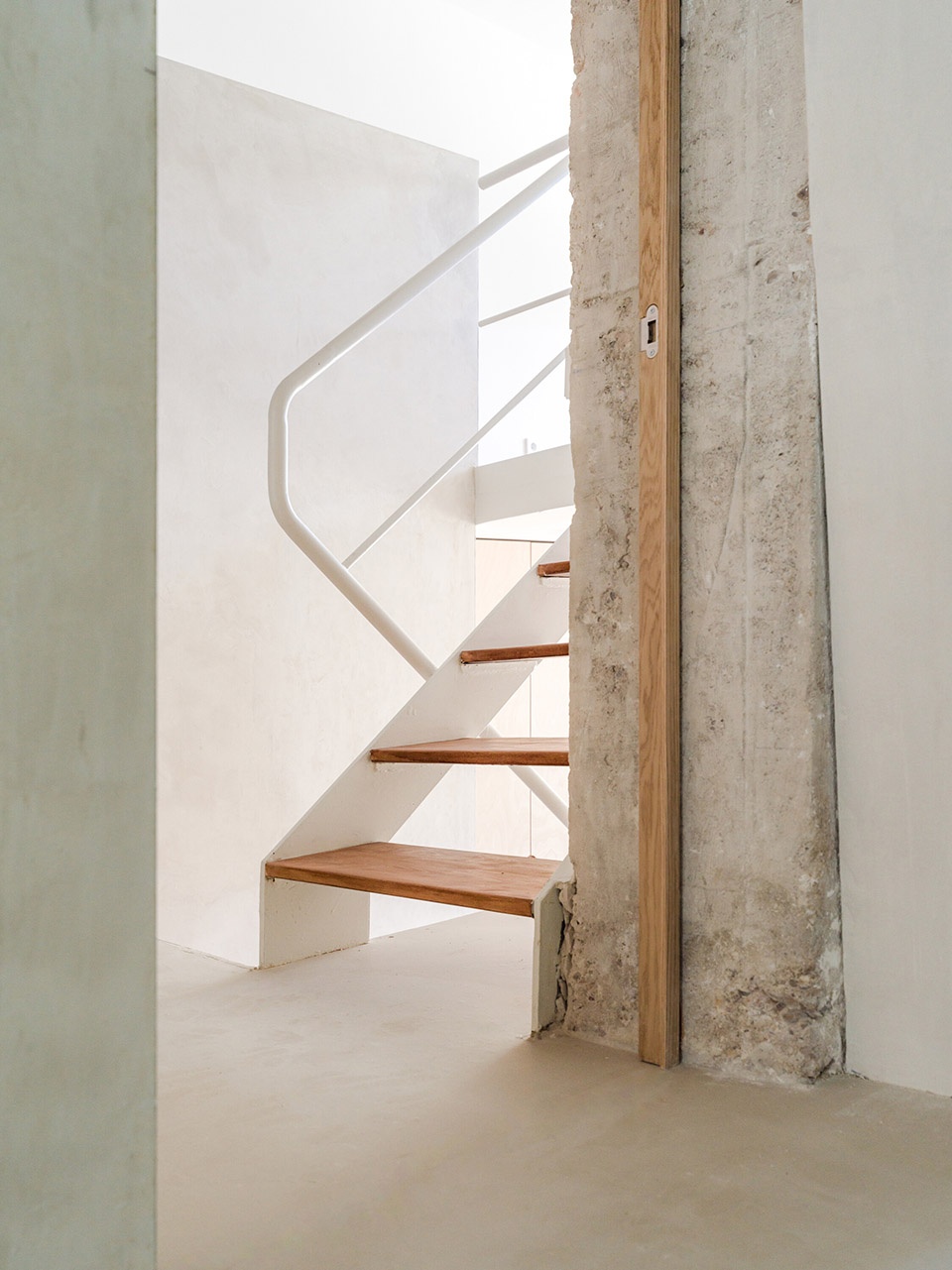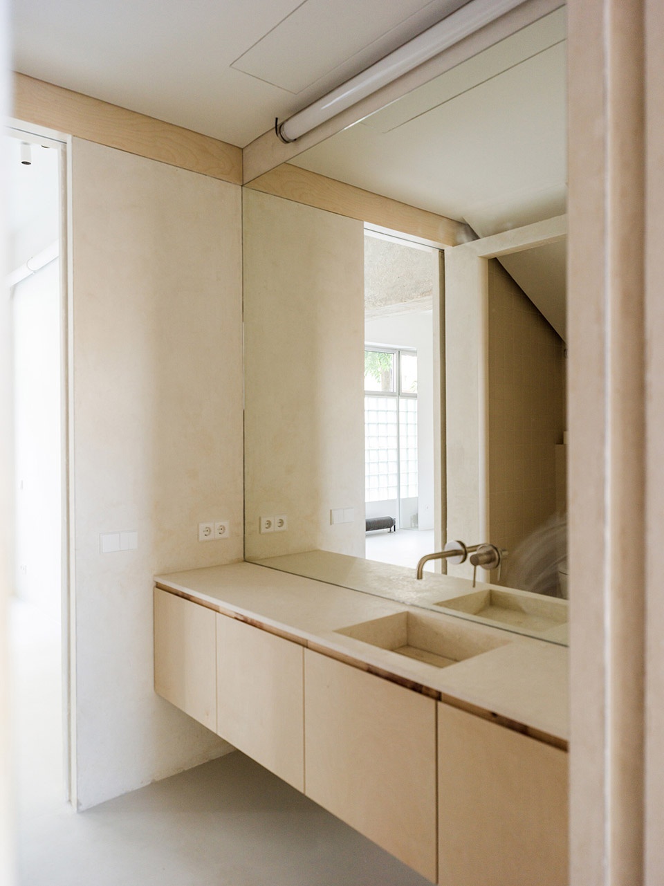 裸露的砖墙与刮磨过的混凝土结构,保留了空间的原始气质;家具中使用的桦木,则为细节增添温润与精准感。原有地面材料被回收并重新铺设,进一步强化了空间的整体性。浴室内坚实的石灰石材,以及厨房与栏杆中使用的不锈钢元素,形成了材质的丰富对比。而整屋采用的自流平水泥地坪则统一了空间语言,形成中性的底色,强化流动性与光感。玻璃砖窗台上的镜面倒角设计,则进一步放大了光线的反射与通透感。
