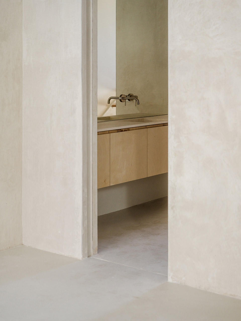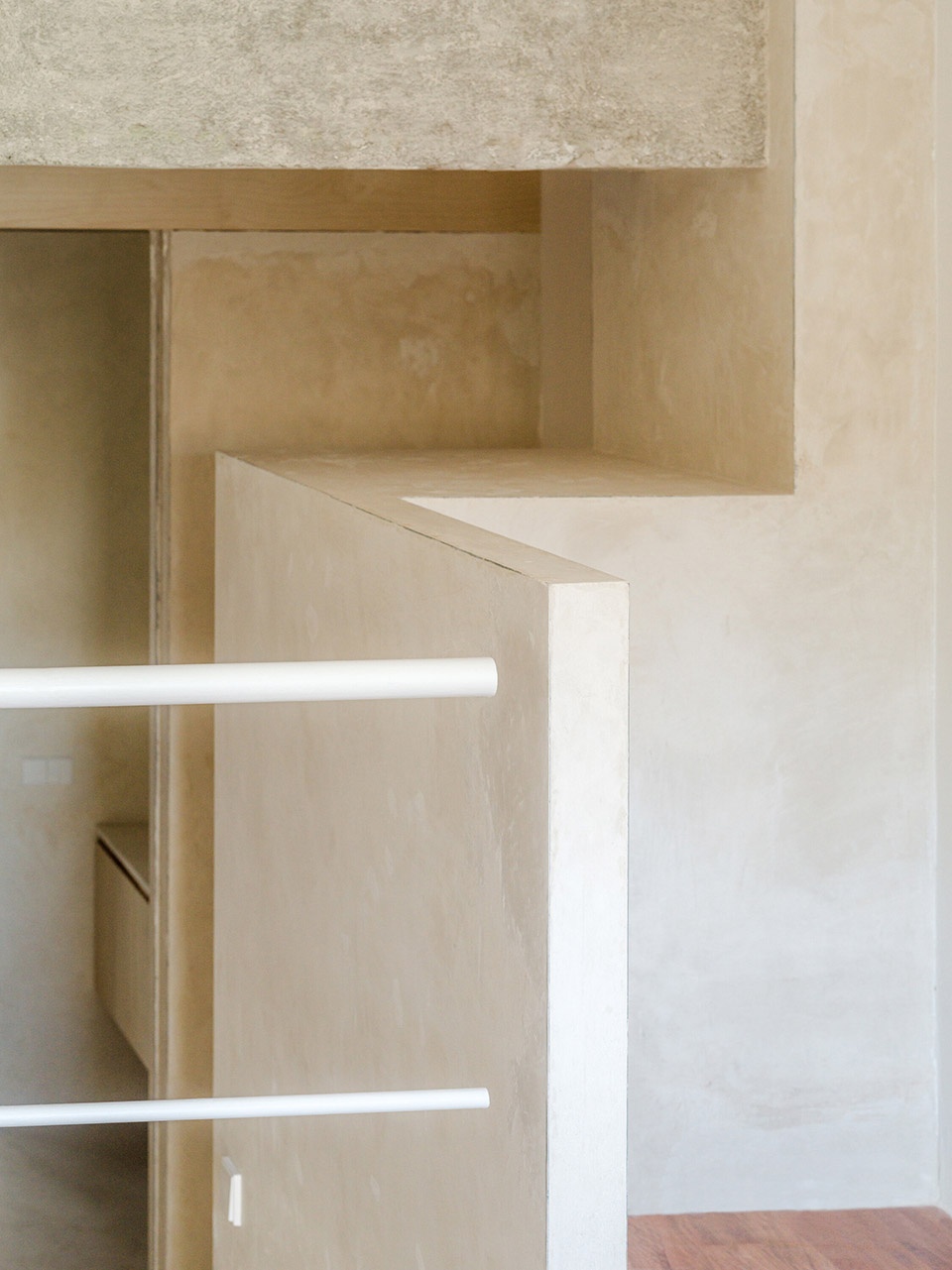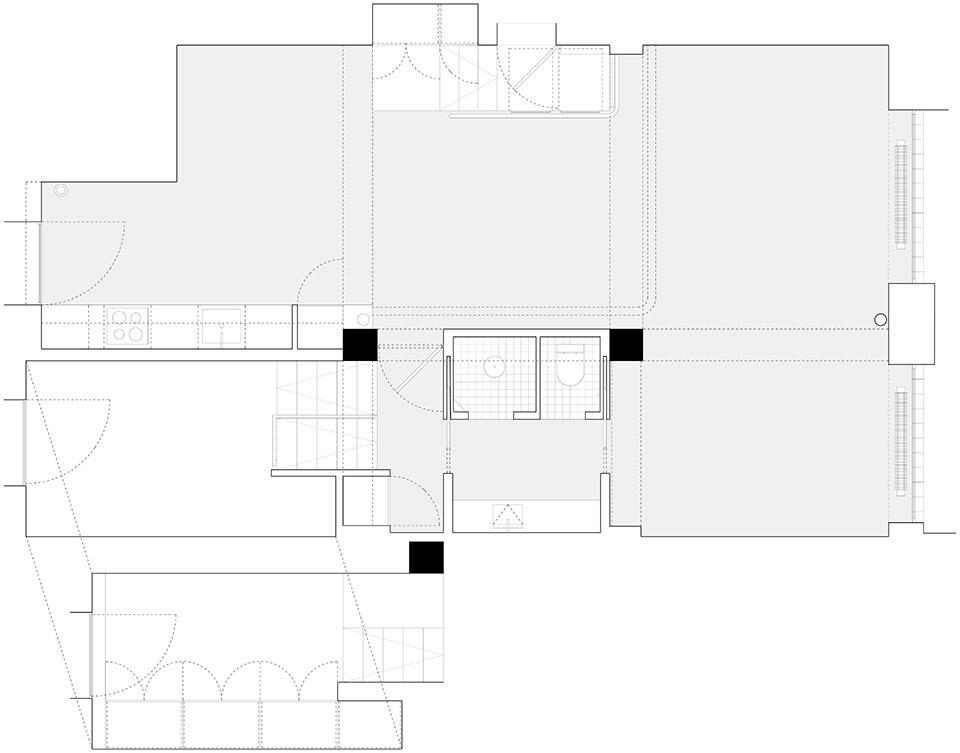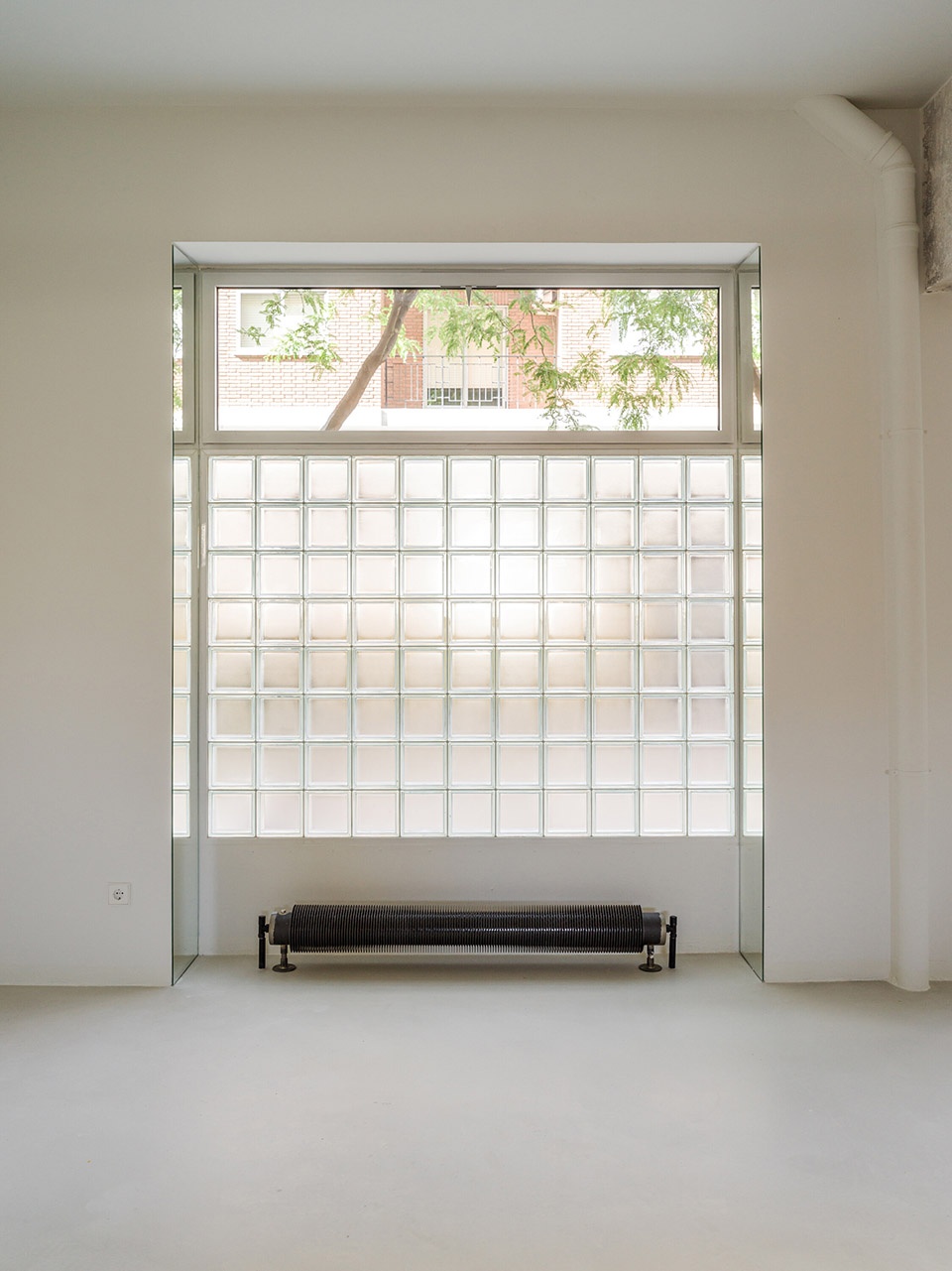 裸露的砖墙与刮磨过的混凝土结构,保留了空间的原始气质;家具中使用的桦木,则为细节增添温润与精准感。原有地面材料被回收并重新铺设,进一步强化了空间的整体性。浴室内坚实的石灰石材,以及厨房与栏杆中使用的不锈钢元素,形成了材质的丰富对比。而整屋采用的自流平水泥地坪则统一了空间语言,形成中性的底色,强化流动性与光感。玻璃砖窗台上的镜面倒角设计,则进一步放大了光线的反射与通透感。