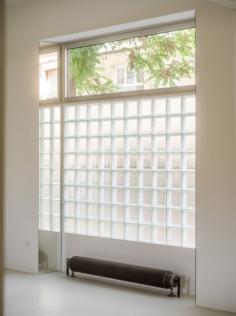 The exposed brick walls and scraped concrete structure preserve the space’s character, while birch wood in the furniture brings warmth and precision to the details. The existing flooring, salvaged and reinstalled, reinforces the overall character of the space, complemented by the solidity of limestone in the bathroom and the sleek stainless steel in the kitchen and railing. The seamless self-levelling mortar floor unifies the space, creating a neutral base that enhances both flow and light, further accentuated by mirrors in the jambs of the glass block windows.