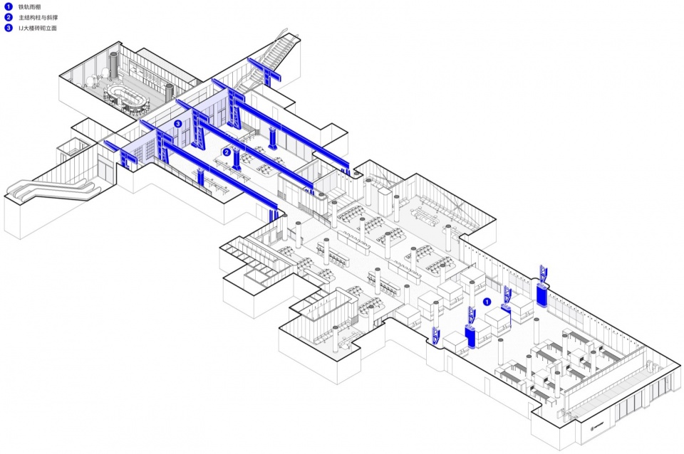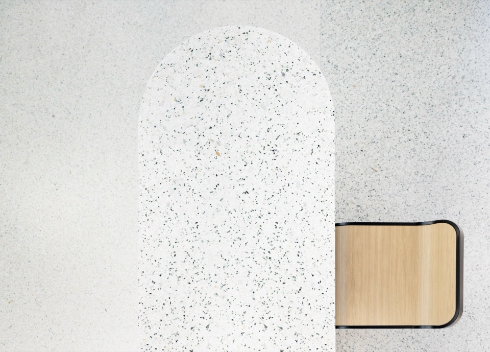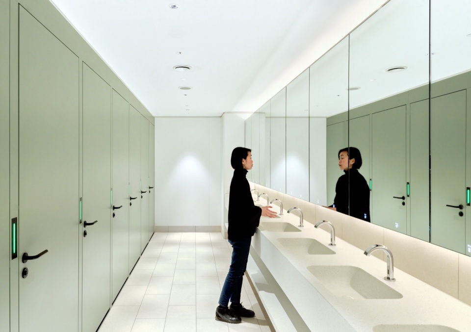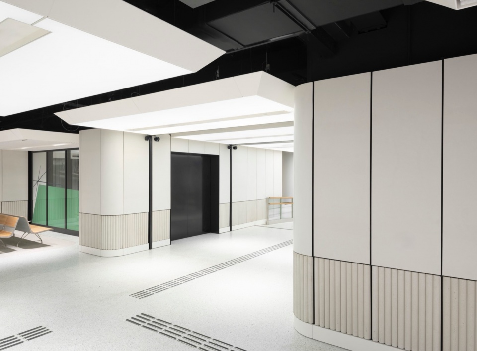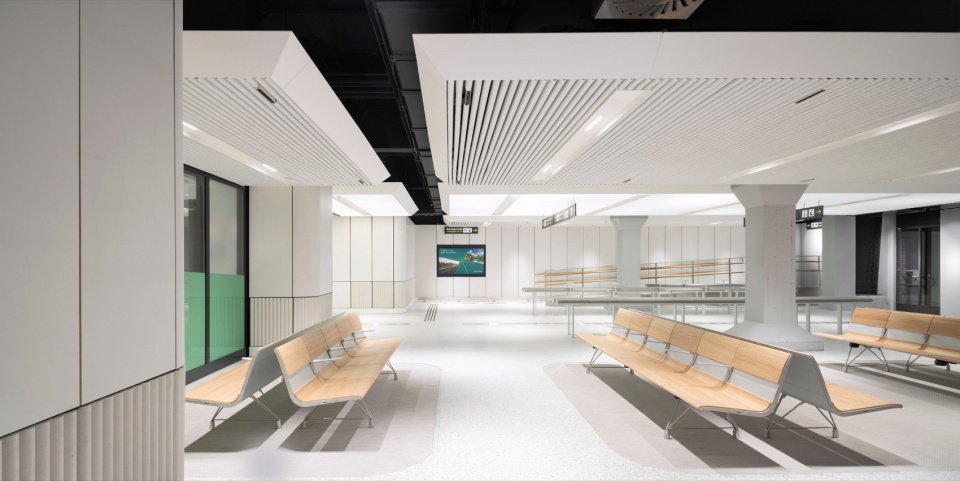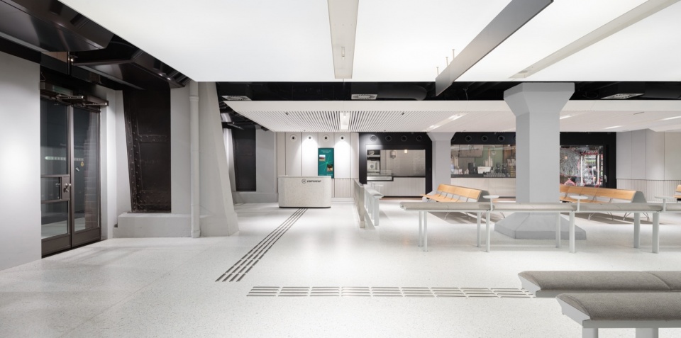 项目设计优先选择“再利用”而非“新建”,通过保留既有结构、复用如喷淋系统等原有设施,大幅减少了建筑材料浪费,并有效保留原建筑所封存的碳排放值。材料选择亦充分体现环保理念:采用生物基隔热材料、负碳足迹水磨石、回收毡材与再生铝材,提升空间耐久性,降低环境负担。此外,分阶段施工采用的临时构件采用模块化系统,便于后期拆解与重复使用,为车站未来的更新与扩展保留了灵活性。