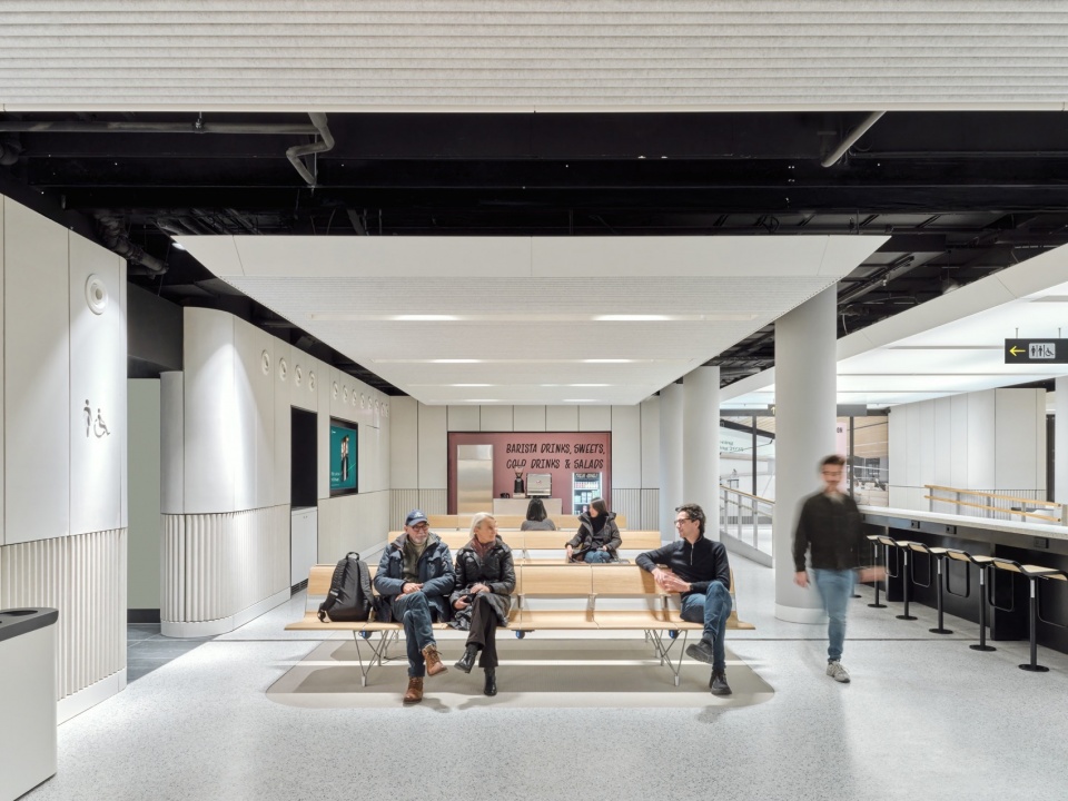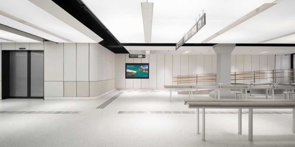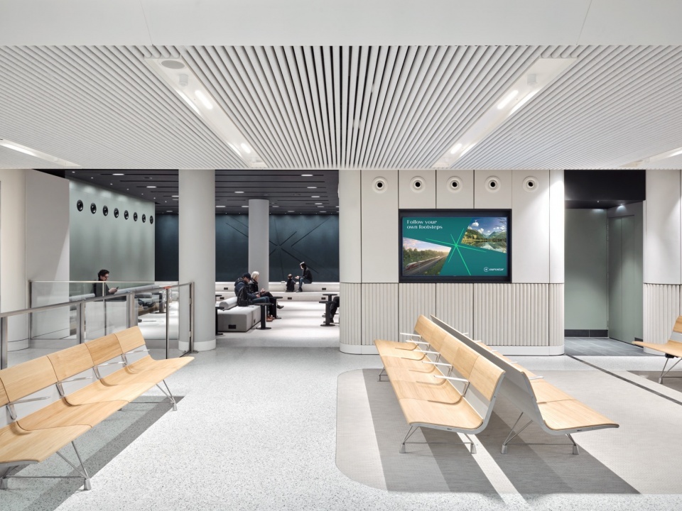 候车区是整体室内设计的终章,设计灵感源自“天与地”的共生关系——既回应了铁路旅行的精神意象,也借鉴了荷、英两国黄金时代的风景绘画。其最引人注目的设计是带有动态灯光的“悬浮天幕”——利用云朵投影来响应一天中的不同时间和乘车流程,营造出静谧又富有动感的氛围。