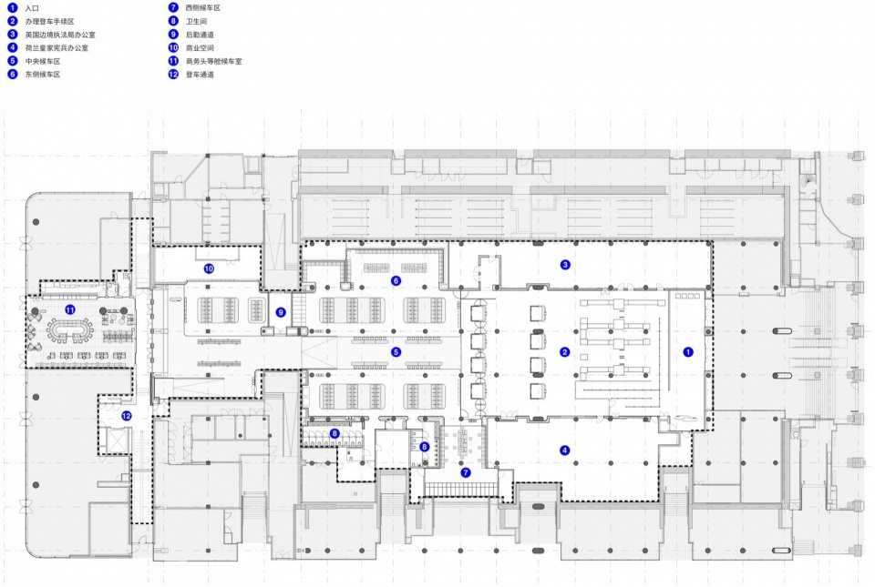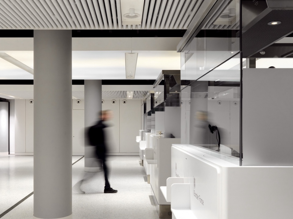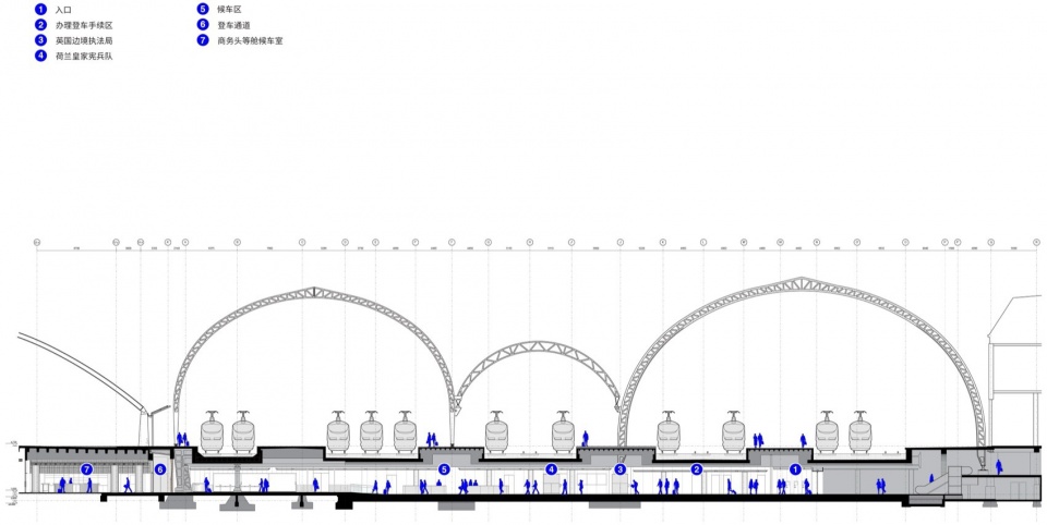 全新的英国专线枢纽站面积是原15站台旧枢纽站的近四倍,作为申根区外边界,配备完整的护照与行李检查流程。专线枢纽站设于原阿姆斯特尔通道(Amstel Passage)之内,是阿姆斯特丹中央车站五条南北向通道之一。清晰的动线原则构成了设计的主线,并始终贯穿于布局和整个空间:旅客从市区一侧的主入口进入,依次完成荷兰与英国的安检、海关与边境检查后,方可进入候车区。