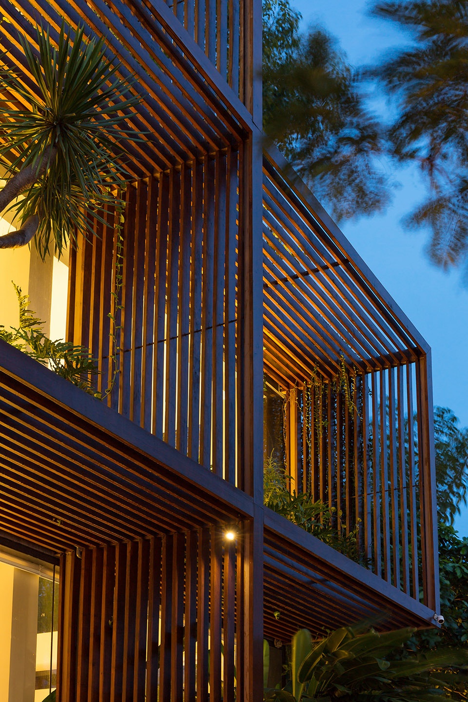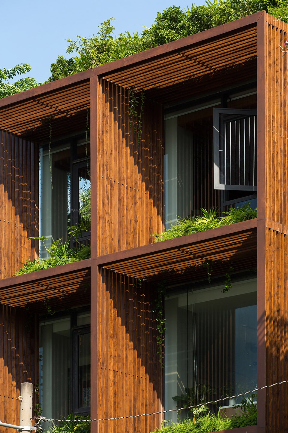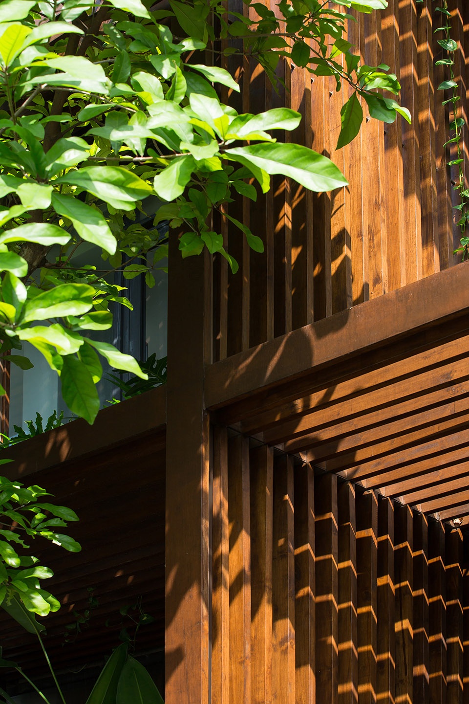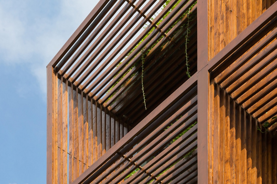 A collective of wood slats forming cubics to provide effective shading against diagonal daylight entering the building. Meanwhile, the setback glazing receives as much as reflected light that benefits the cooling and lighting cost in building maintenance.