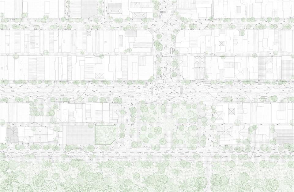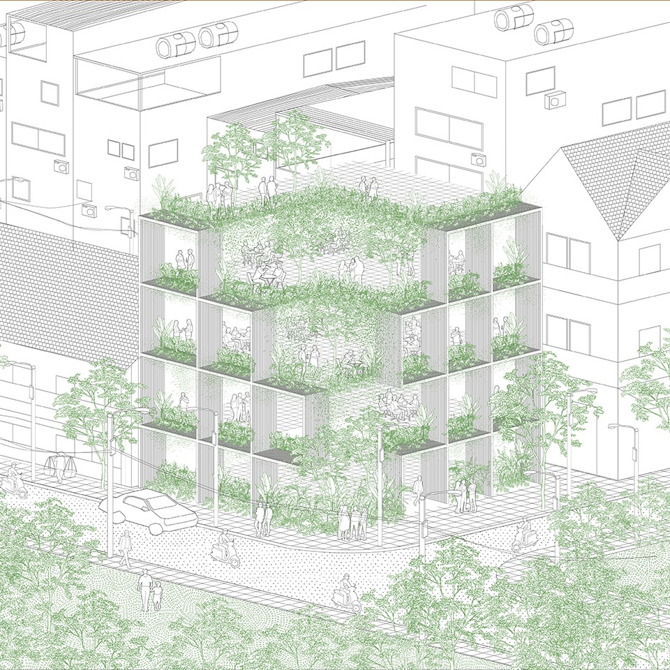 The idea of utilising a perforated geometry allows the possibility to generate intermediate space for shading while maintaining expansive visual contact from inside the built environment to the urbanscape outside. On the other hand, setting back the hard construction creates rooms for outdoor greenery that results in a natural skin covering daylight exposed facades.