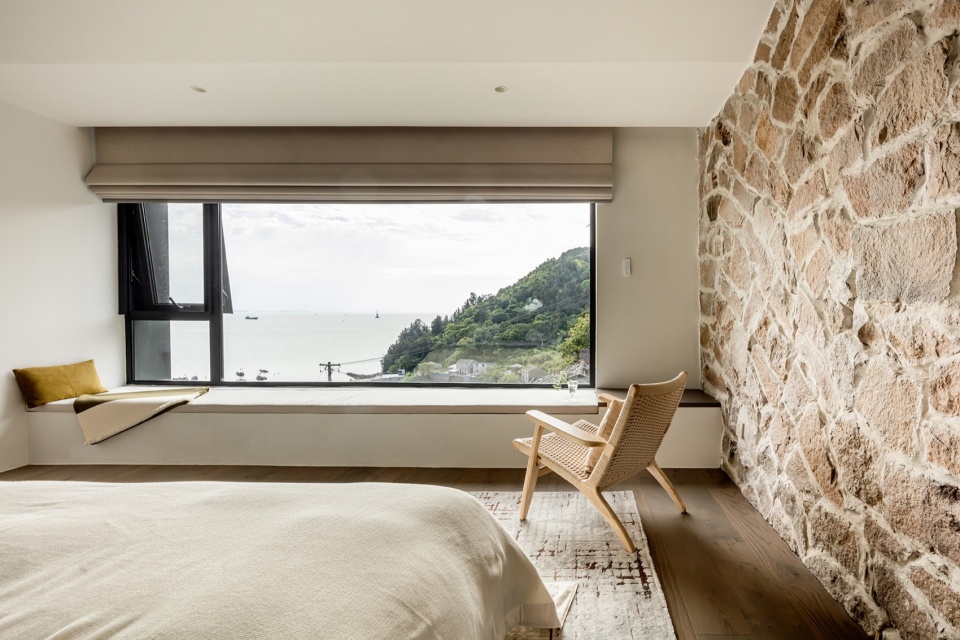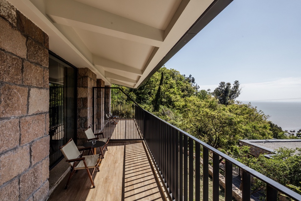 客房建筑以混凝土框架为结构基底,回收原址虎皮石砌筑外墙立面,与屋顶工业质感的铝镁锰板形成材质对话;公区空间融入船舵、潜望镜、船木肌理等海洋元素,通过虎皮石的沧桑感与清水混凝土的静谧交织出“记忆与重生”的空间诗篇。