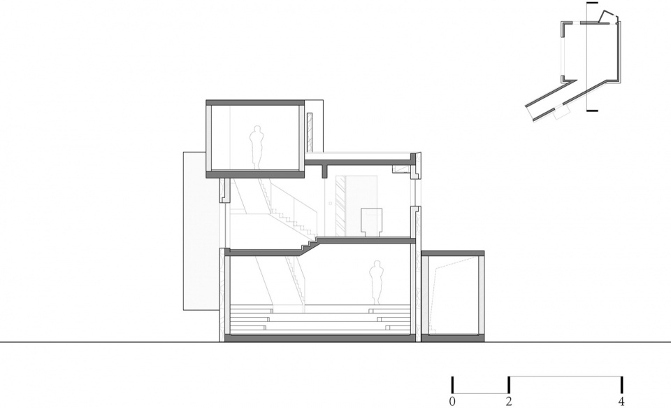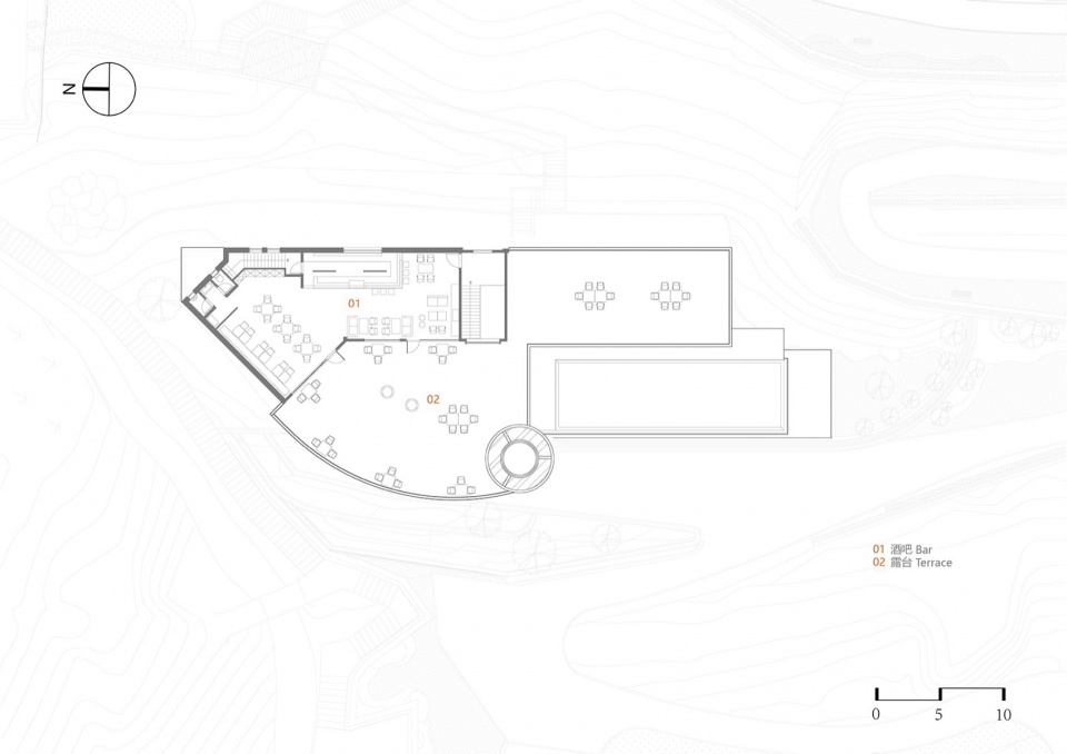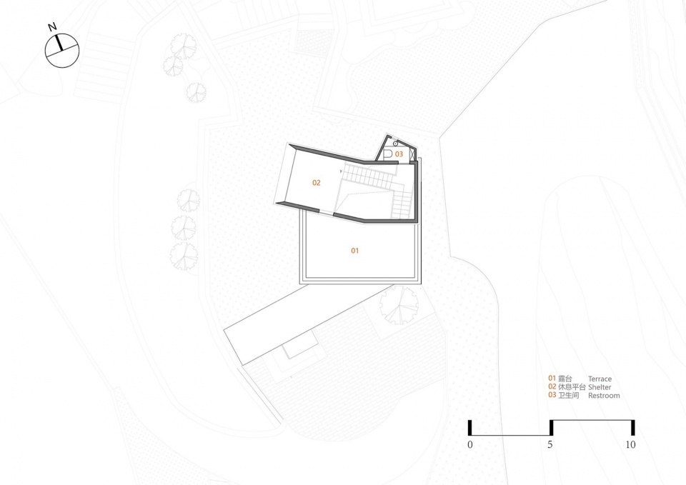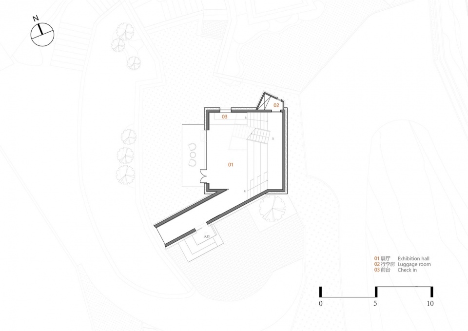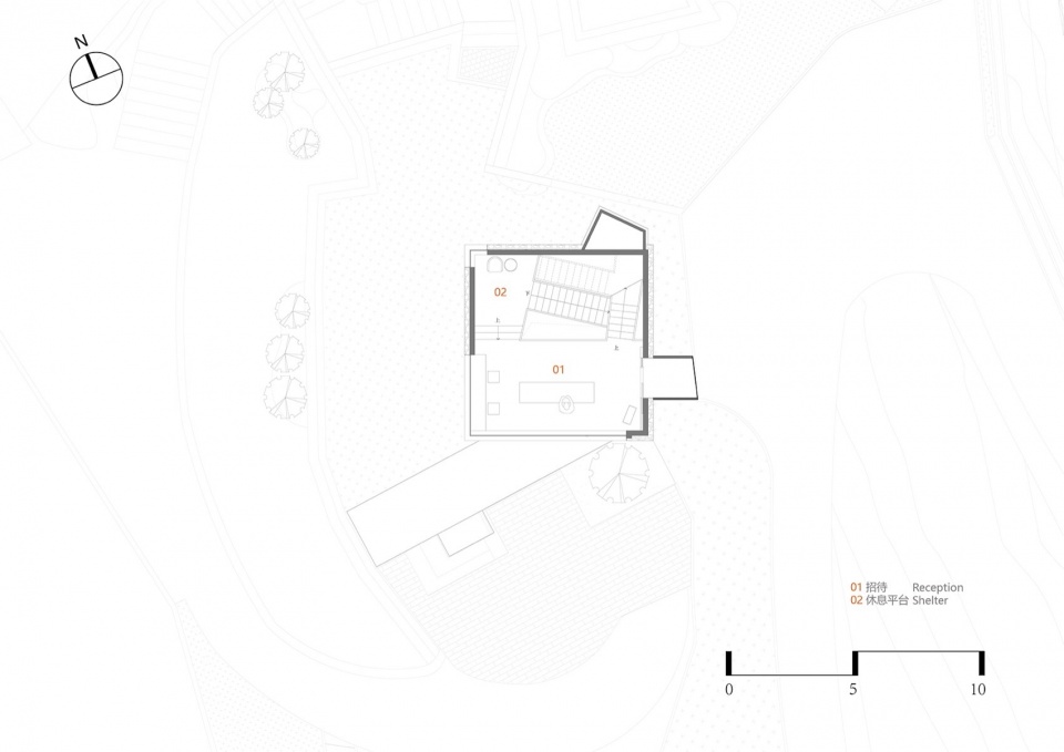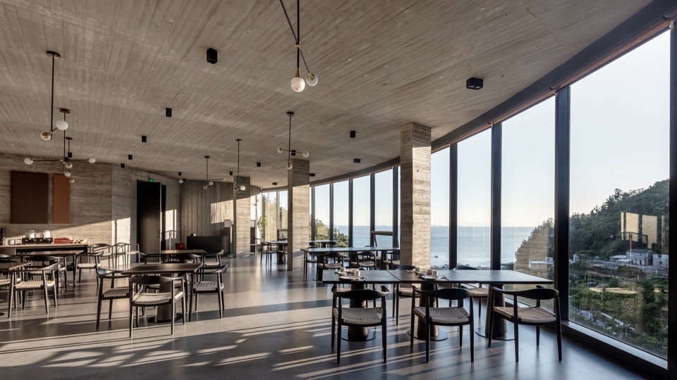 1号楼·潜望式checkin 前厅:建筑占地只有49平方米的微型综合前厅、不仅能在此办理入住,还可在内部游逛,微展厅与迷你商店的概念植入在不断攀升的空间中,建筑虽小,顶楼向外延申的落地窗犹如矗立在山脚的潜望镜。坐在二层面西的横向扁长转角窗,感受时间大海的流动与永恒。