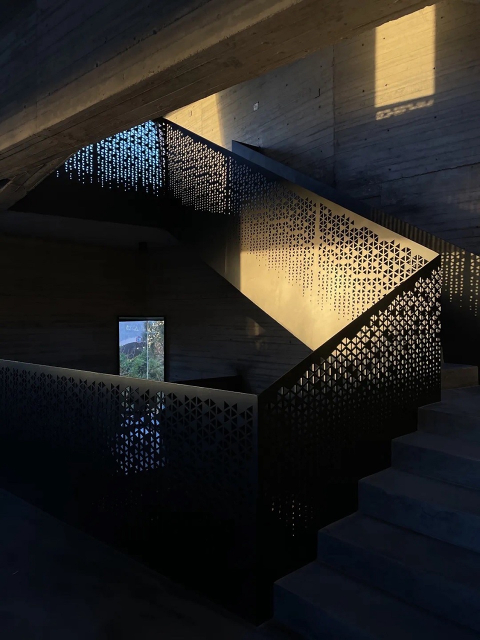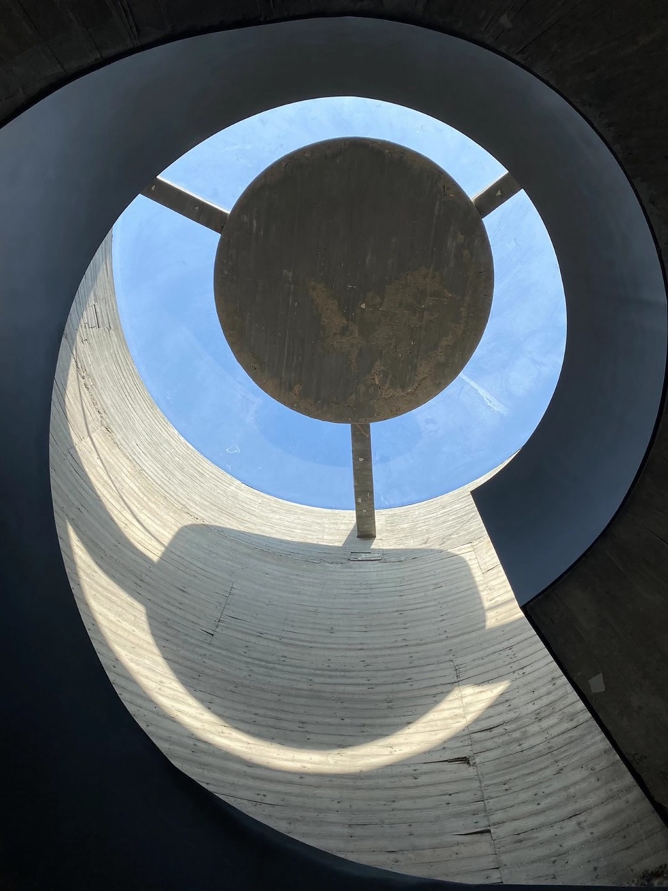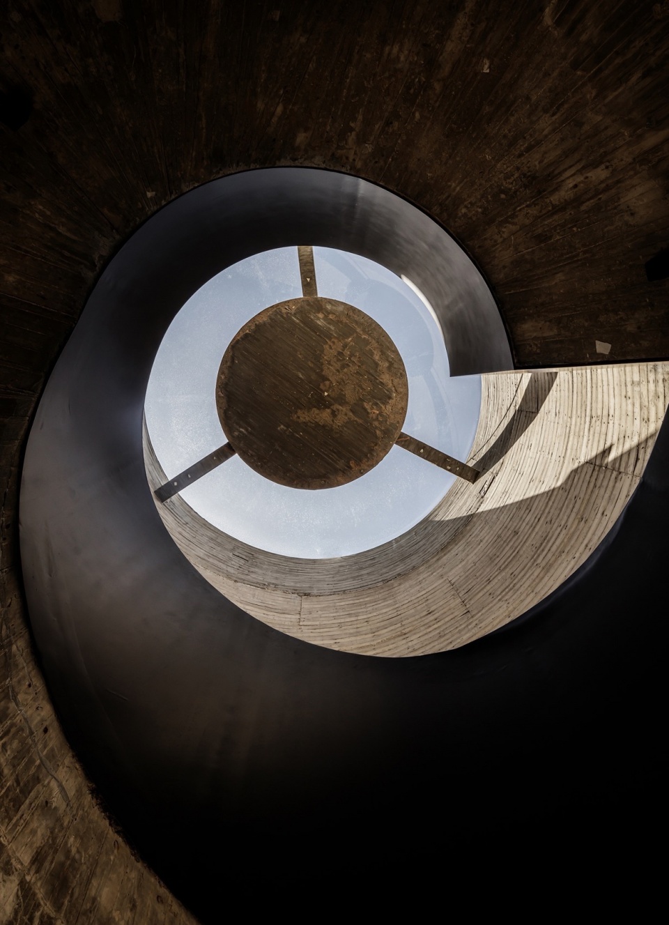 Building 2 · Hybrid Micro-Theater: Moving from Building 1 to the service building, visitors ascend a spiral staircase of fair-faced concrete, shaped like a conch shell. A ship-wheel-inspired skylight traces the sun’s path. Preserved *tiger-skin stone* and concrete walls frame views of mountain and sea, drawing the landscape inward as focal points.