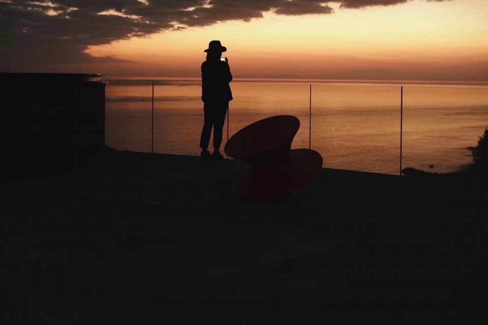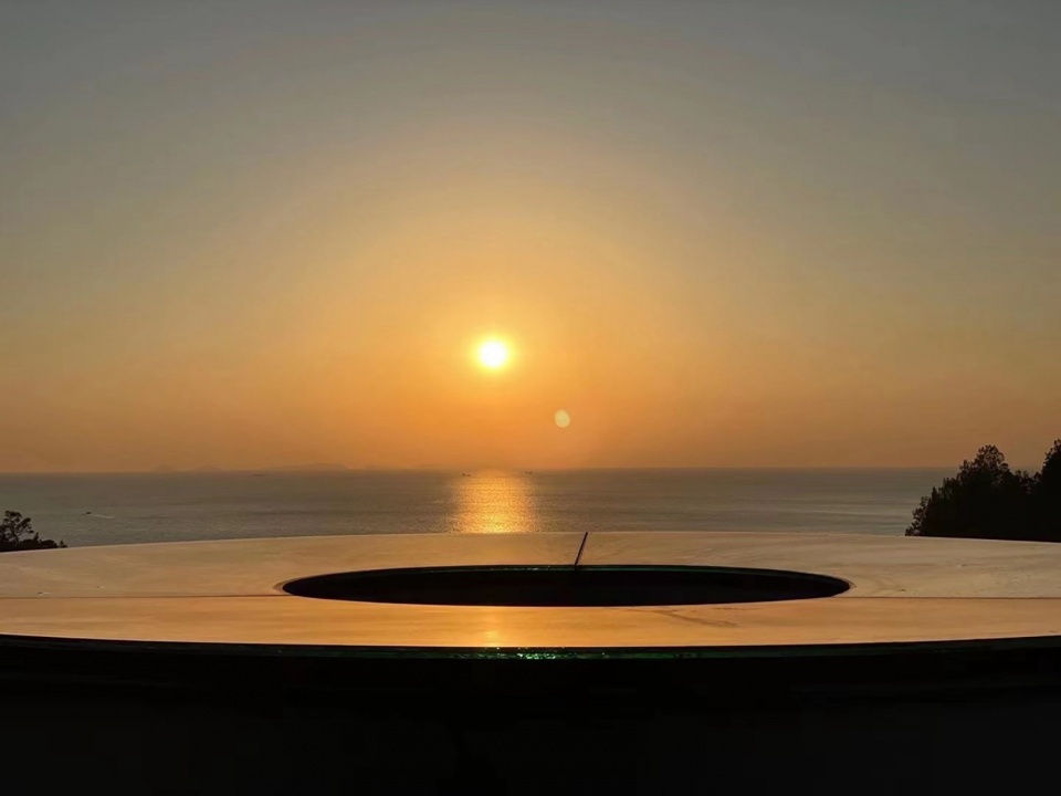 2号楼·复合微剧场:跨出1号楼移步至2号服务楼,首先通过海螺状清水混凝土楼梯盘旋而上,船舵造型的天顶呈现日轨的变化,保留的虎皮石墙面与混凝土墙将山海景观纳入室内,形成视觉焦点。