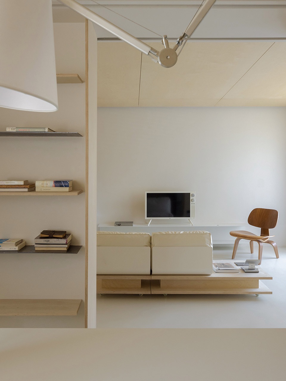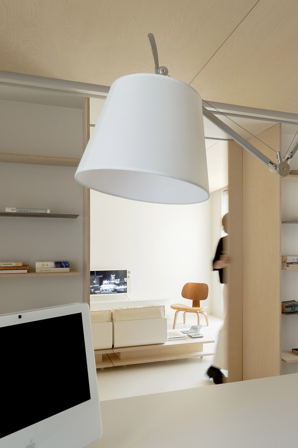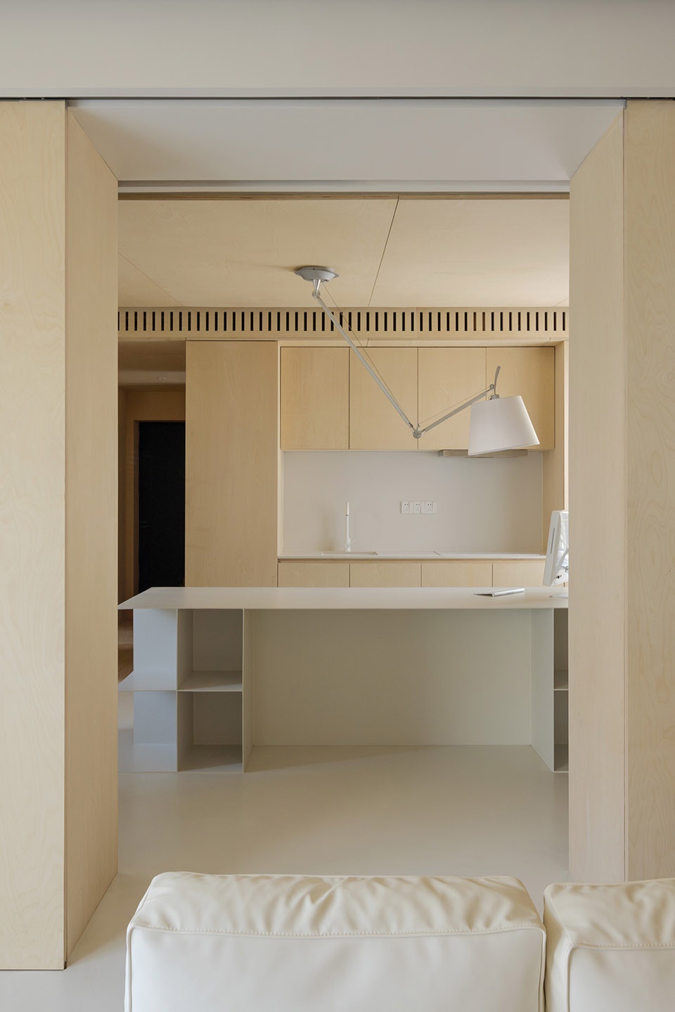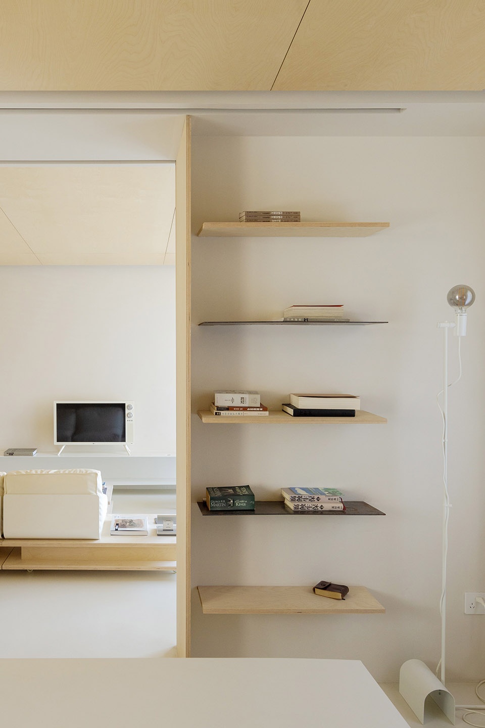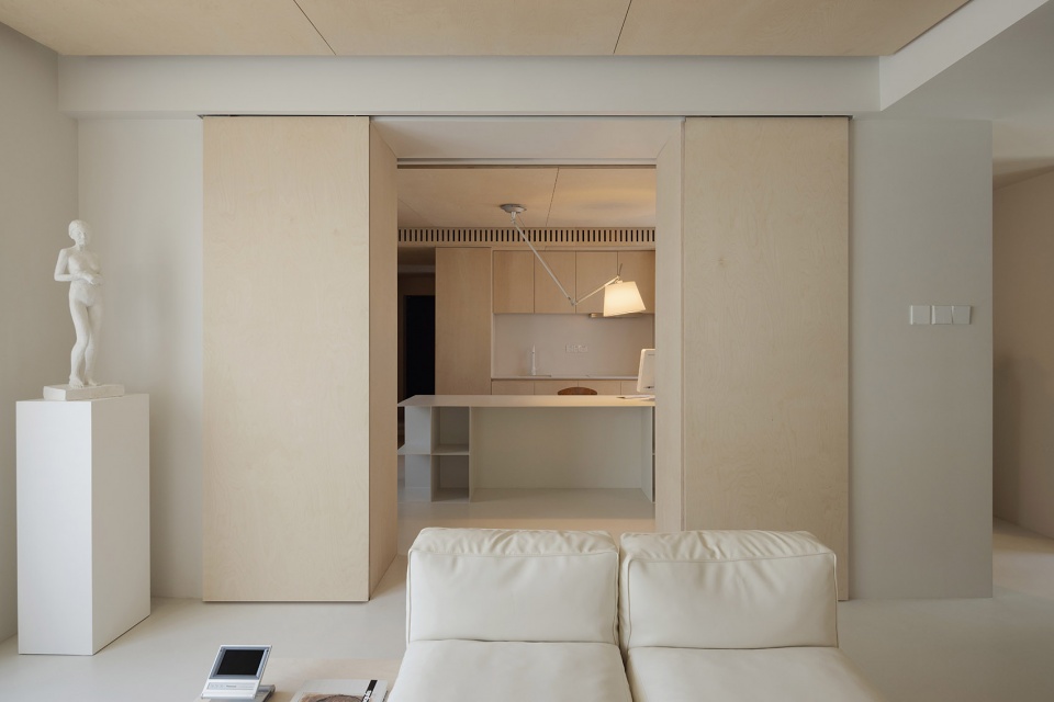 通高的门板在移动时,既划分区域又保持视觉的连贯性。当门完全打开,相邻空间融为一体;当门半开或错位停放,则形成一种空间过渡;当门完全闭合,又能自然划分出相对独立的私密空间。