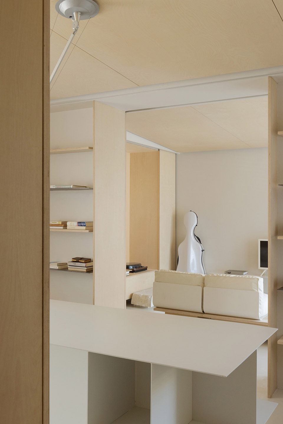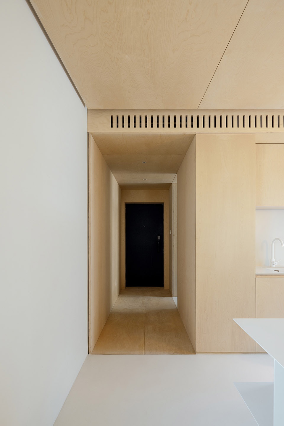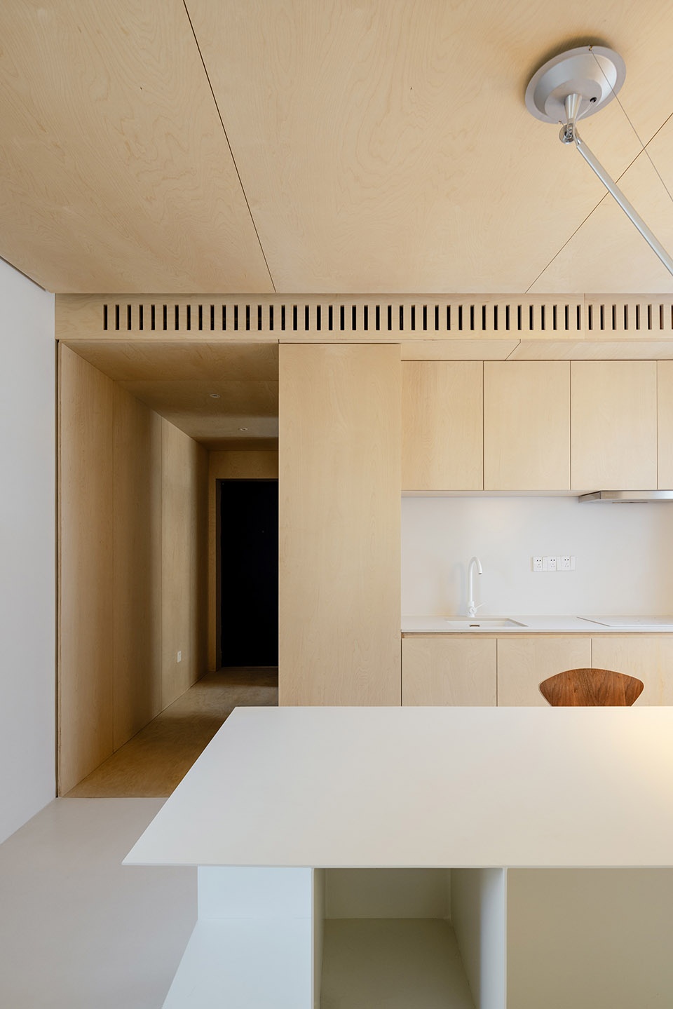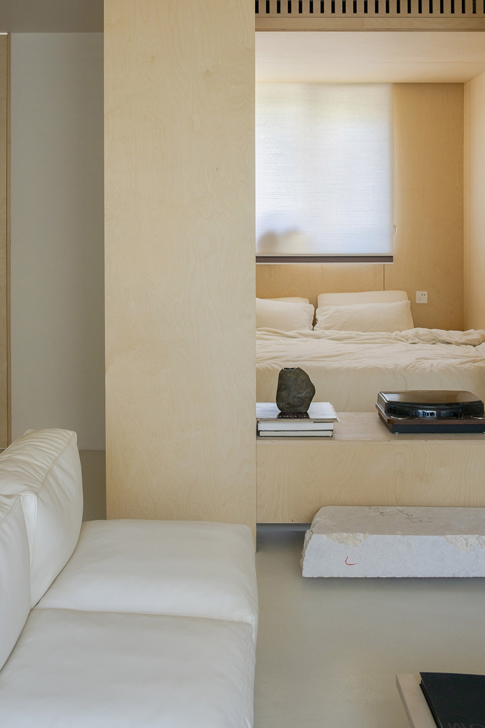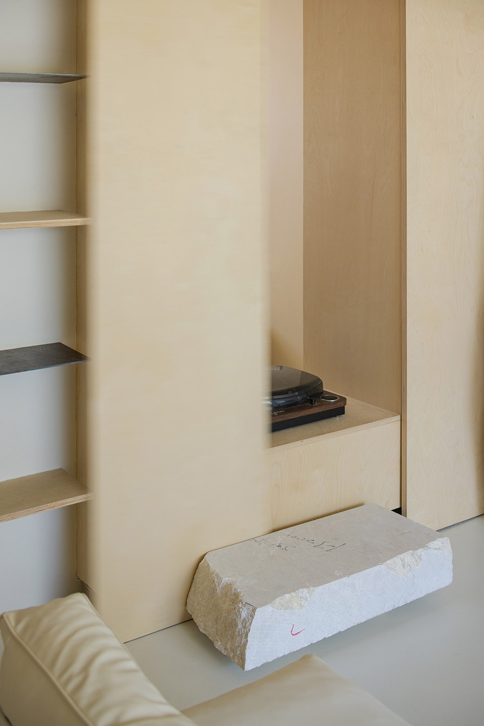 the raw texture of the birch boards gives the space a pure and natural atmosphere