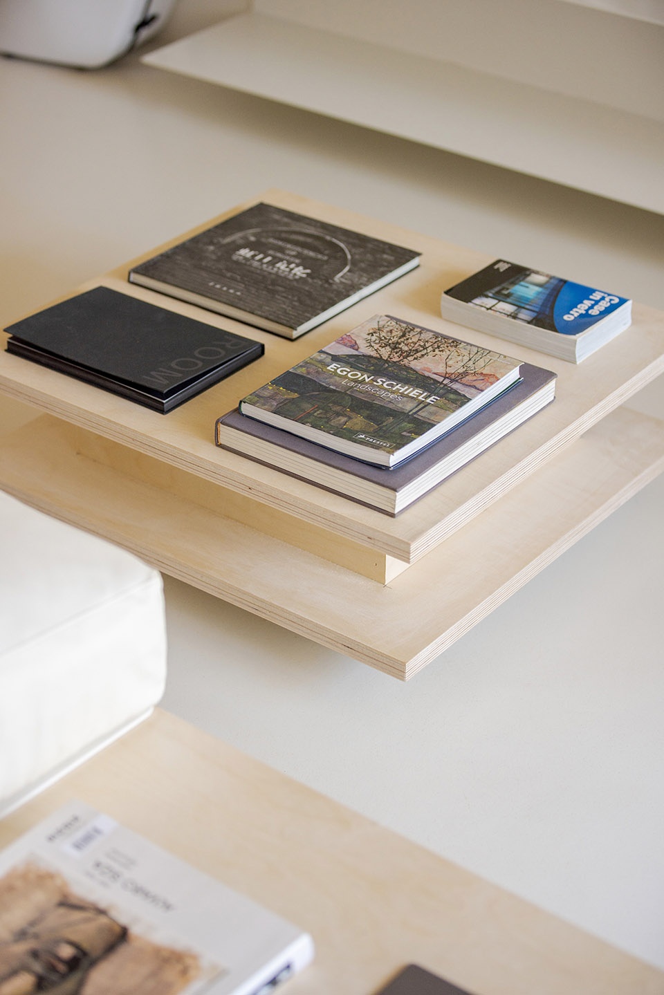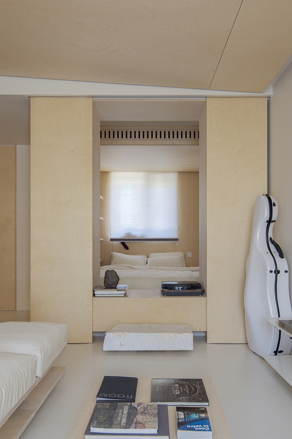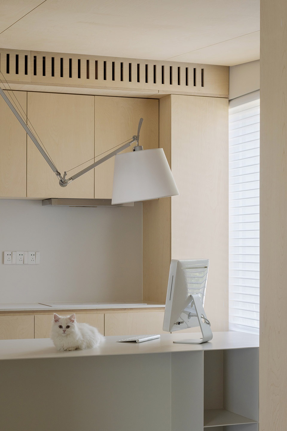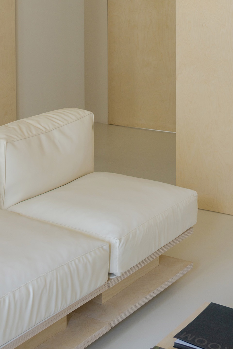 the raw texture of the birch boards gives the space a pure and natural atmosphere