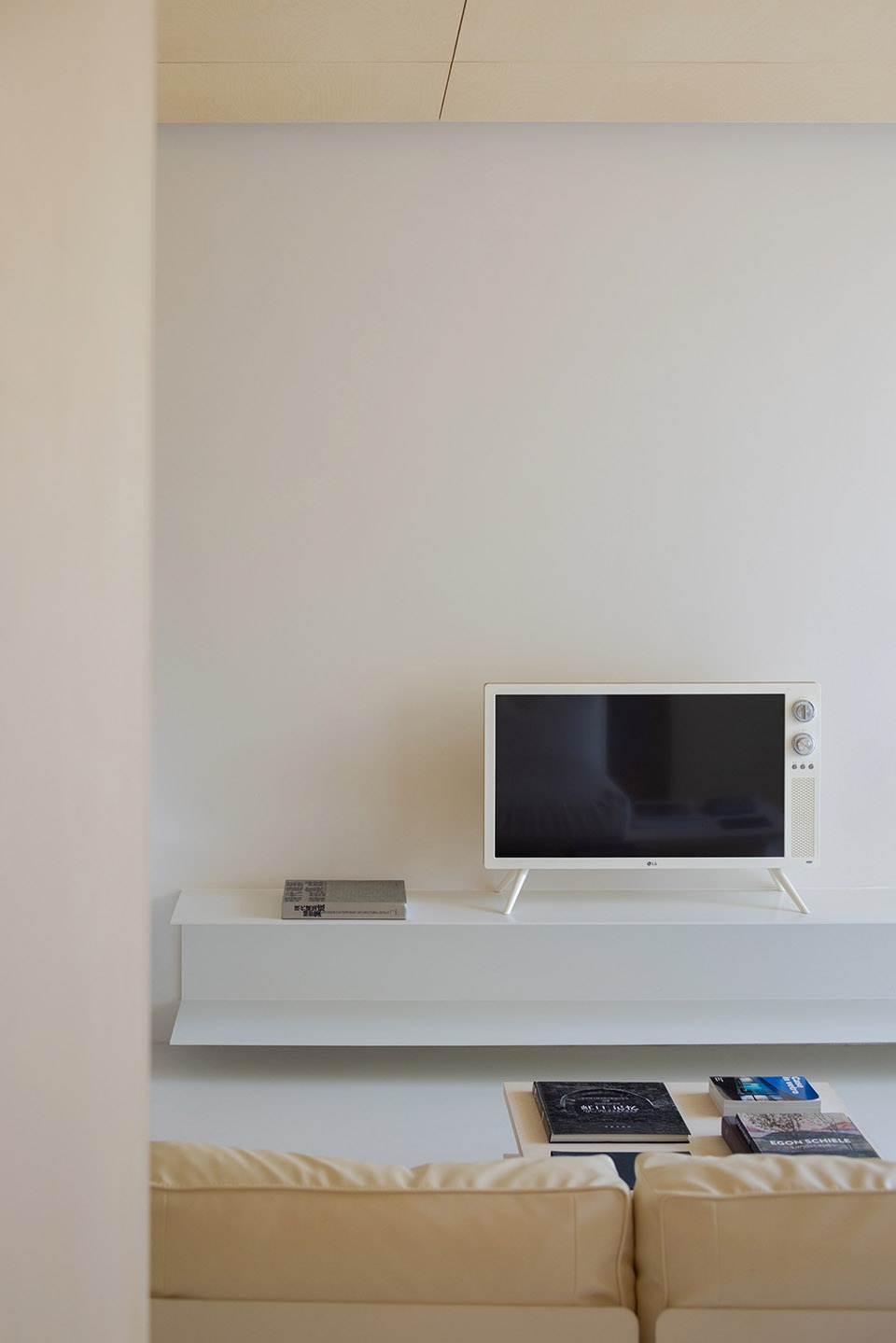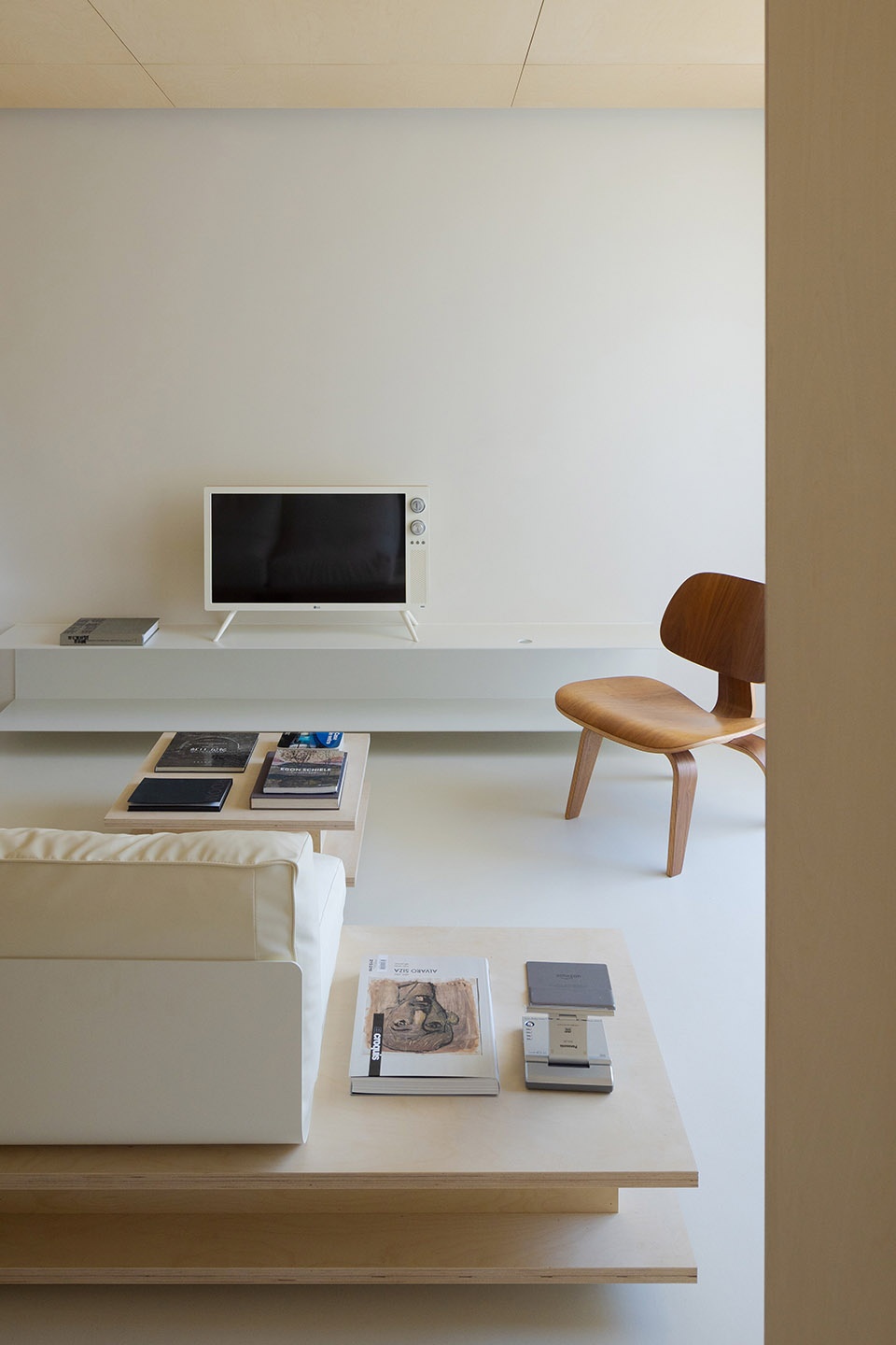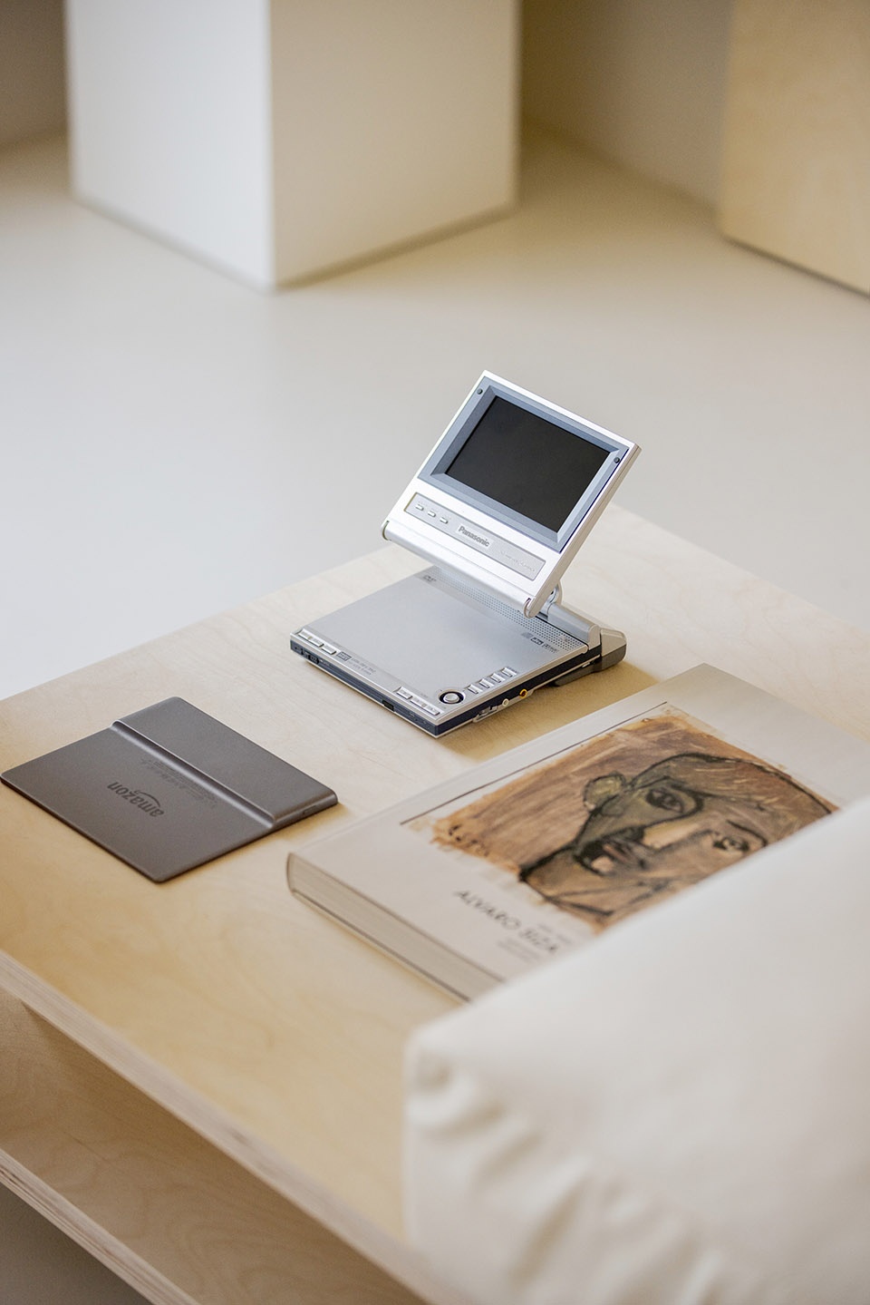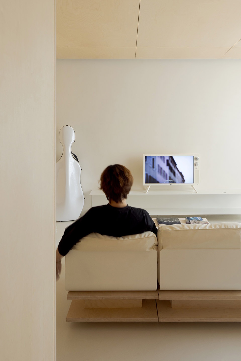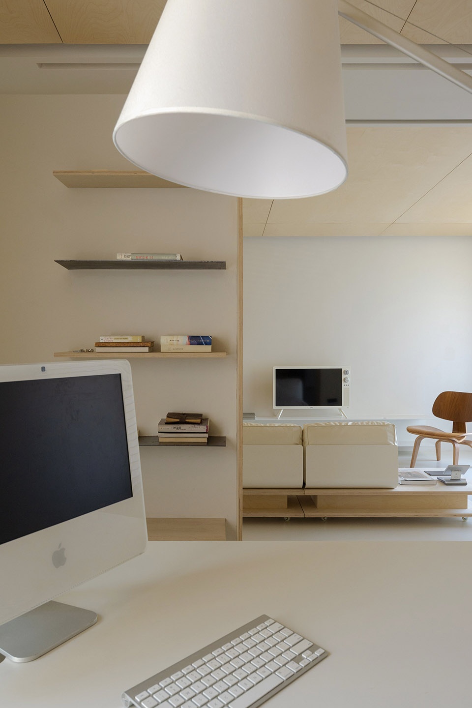the raw texture of the birch boards gives the space a pure and natural atmosphere