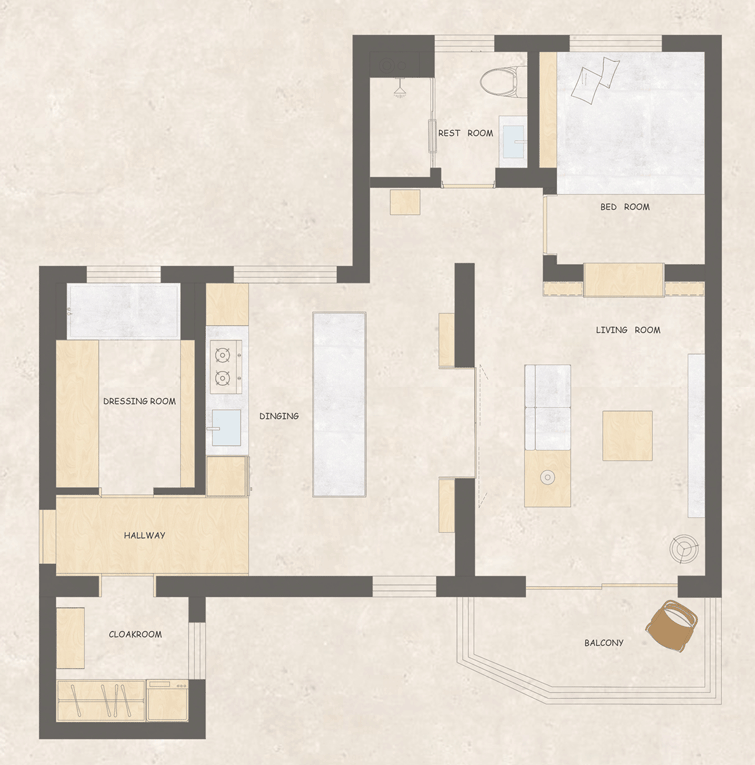 In the field domain of residence, door planks are used as the medium of spatial connection to not only create privacy for people, but also reinforce the concept of “Space” in the residence. We remove the non-load-bearing walls inside the rooms to achieve the better interaction and dialogue between the spaces. By enlarging the size of the door planks, we imbue them with a ceremonial presence in the space.