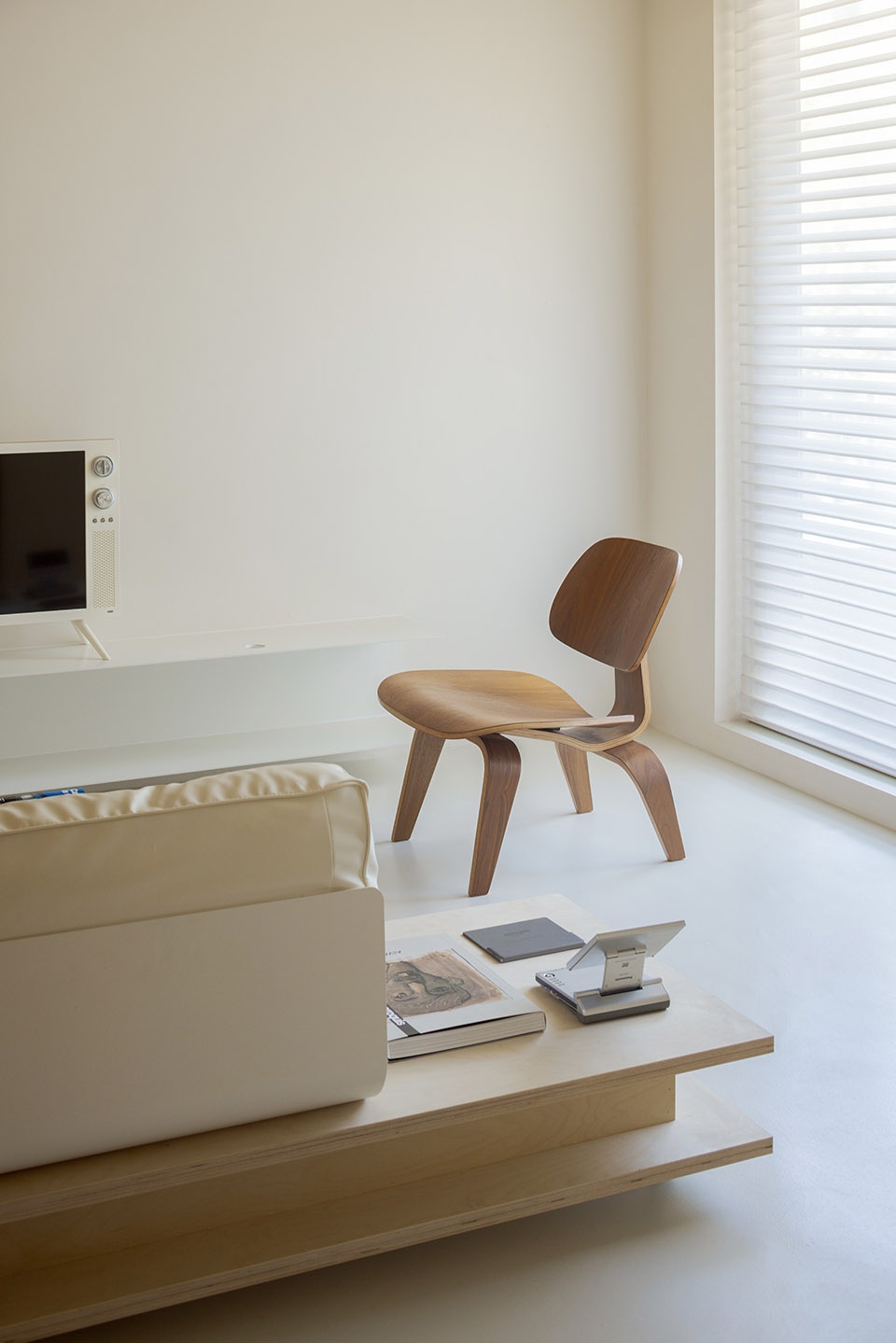 桦木板、铁板和涂料等原始材质质感,让空间内的视觉感受纯粹自然。立面结构搭建与材质的比例分配,经过反复推敲也得到了很好的平衡。我们让材质与空间的关联并非简单的表面装饰,而是建构空间本质的核心要素,同时也成为空间本身。