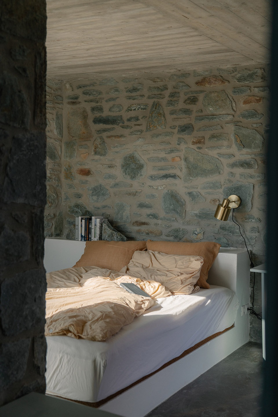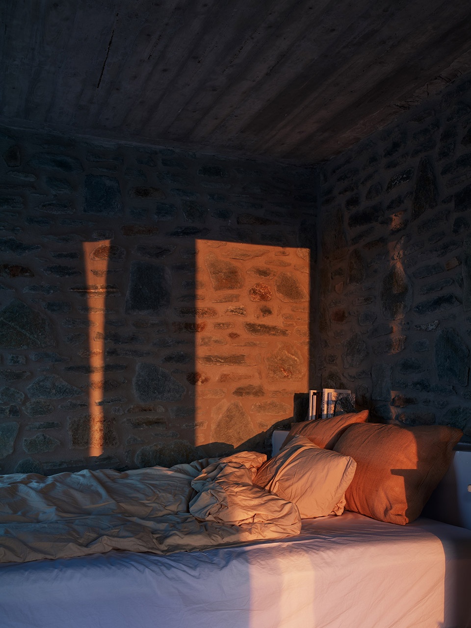 Emphasizing outdoor living, the house features an outdoor kitchen for cooking and dining under the open sky, complemented by an outdoor shower. Stone plinths provide seating for both dining and contemplation, seamlessly integrating with the natural surroundings. A movable dining table allows guests to adjust their meals according to the changing sun and breeze. At night, a small room made of local stone offers shelter from rain and wind, equipped with essential amenities like a bed, a workspace, and a toilet—making it the only heated space in the house for indoor living. The design encourages guests to embrace outdoor life while enjoying the island’s nature and tranquility.