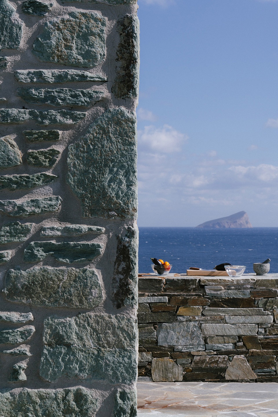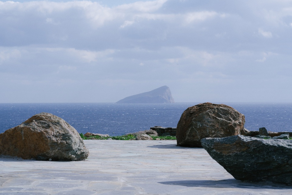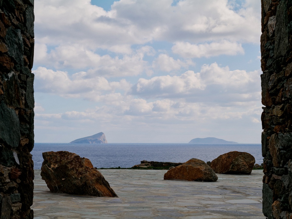 Serving as a guest house for the nearby Piperi House on Kythnos Island, the Outdoor House is perched on a hillside terrace, seamlessly integrated with the natural stone landscape. The entrance, which resembles a garden door, leads into a space with a framed view of Piperi Island, merging with the infinity terrace framed by two parallel stone walls. Here, the rocks and sea appear to blend, extending the island’s natural beauty onto the land. As one moves forward, the horizon expands, and The Outdoor House with its stone plinths appears.