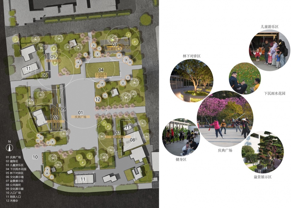 设计调研了文化公园的多种使用模式。首先,文化公园常年承接多种大型集市展会的活动,节假日人流密集,需要有弹性使用的广场空间和人流集散场地。其次,现状市民需要儿童游乐、健身活动、棋艺扑克、盆景花展、休憩闲聊等固定空间。因此设计提出一心五区的设计布局,围绕中心广场展开一系列的市民使用空间。