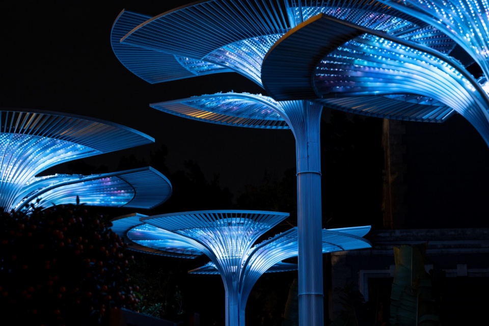 应文化公园对举办春节花市、元宵灯会、中秋游园、花展盆景展、文艺集市会等各类不同主题的市民文化活动需求,设计团队研发了集照明、屏幕显象、智能音控、景观照明等多功能合一的木棉伞,配合各类活动的氛围背景。