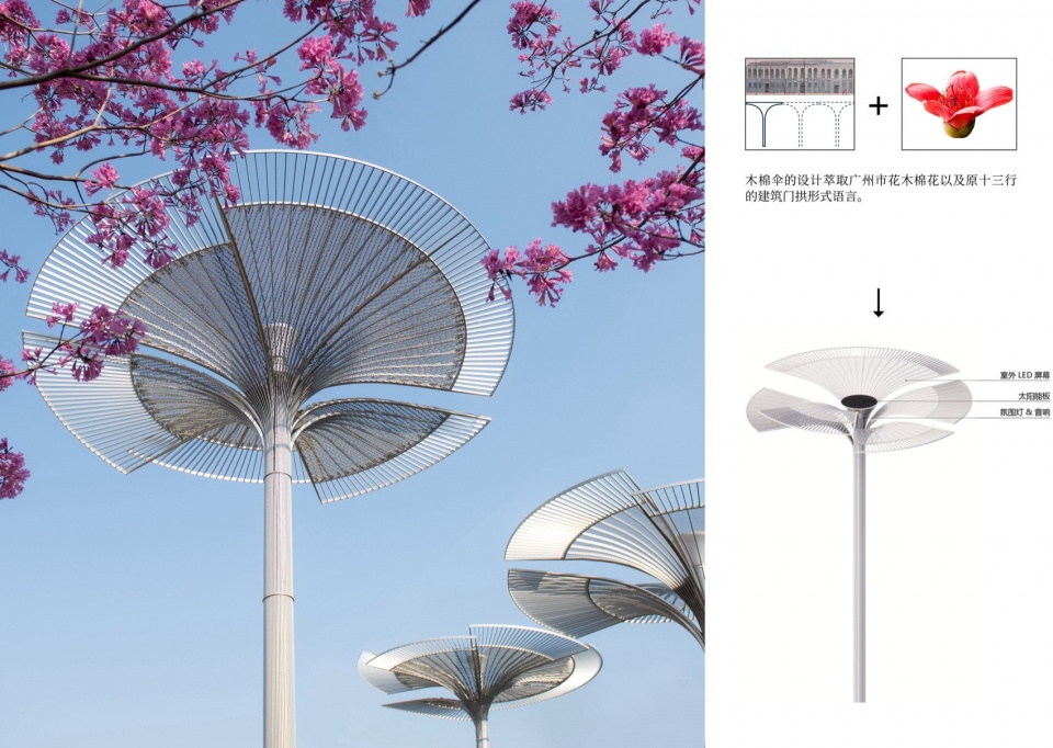 Positioned in areas where large trees cannot be planted due to subway restrictions, the Kapok Umbrellas complement the surrounding greenery and create a distinctive landscape, especially visible from nearby elevated roads.