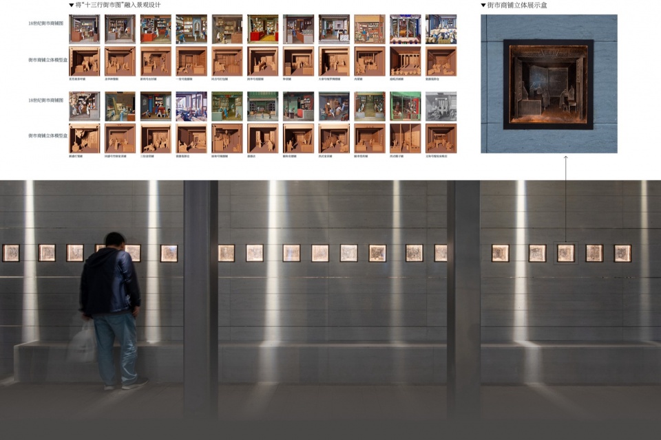 十三行时期的广州是中国对外贸易交流的窗口,在历史上有举足轻重的地位。虽然十三行原址的格局现今在文化公园场地上已不复存在,但是根据留存的十三行时期的”外销画”中的市井商馆画,风雨连廊的展窗设计通过微缩景观还原了十三行时期市井商馆的繁荣景象,向市民展现了当时十三行时期的商贸文化场景。