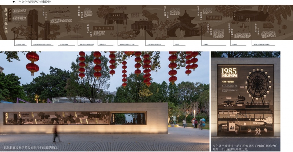 设计萃取场地的十三行的历史文化故事、华南土特产展馆时期的展会故事以及文化公园西南角作为广州第一个儿童游乐场的历史元素,创意性的融入场地的儿童游乐设备、健身器材、微缩景观、展廊景墙、互动灯光中,让市民在游玩中也了解到场地的发展历史,讲述了文化公园的文化故事。