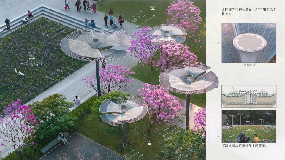 在可利用的绿地空间结合雨水花园的措施收集地表泾流进行调蓄错峰,具有土壤湿度和降雨量感应功能的智能灌溉系统可以有效节约灌溉用水。木棉伞结合太阳能光伏板供能充电,降低市政电能消耗,助力降碳。