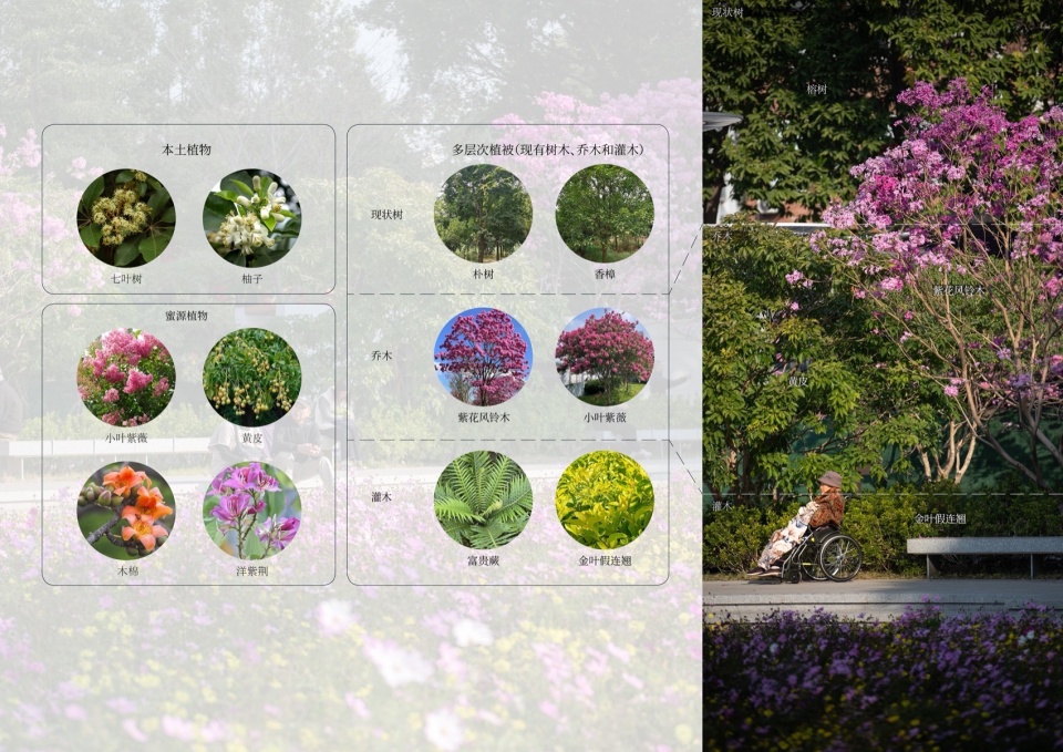 All original mature trees on the site are preserved, and 80% of new plantings are sourced from the original park species and local varieties, ensuring ecological continuity.
