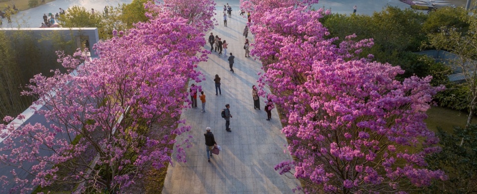 木棉伞成组团的穿插于场地因地铁上盖的限制不能种植高大乔木的地方,与中小乔木交相映衬,也成为场地周边特别是高架桥视野的标志性景观。