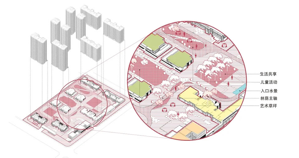 The design of the block not only weaves the richness of life behavior in the large community, but also improves the energy level of the plot in the region: the sky is blue from a single "community" to the vitality core of a large community, and the atmosphere of the community can also continue beyond the fence.