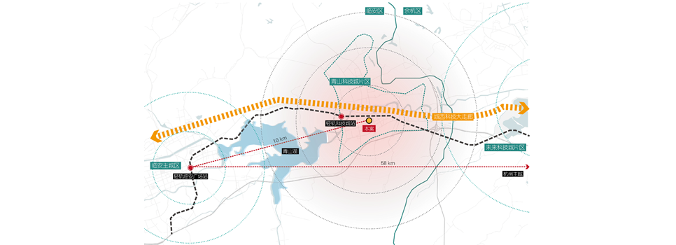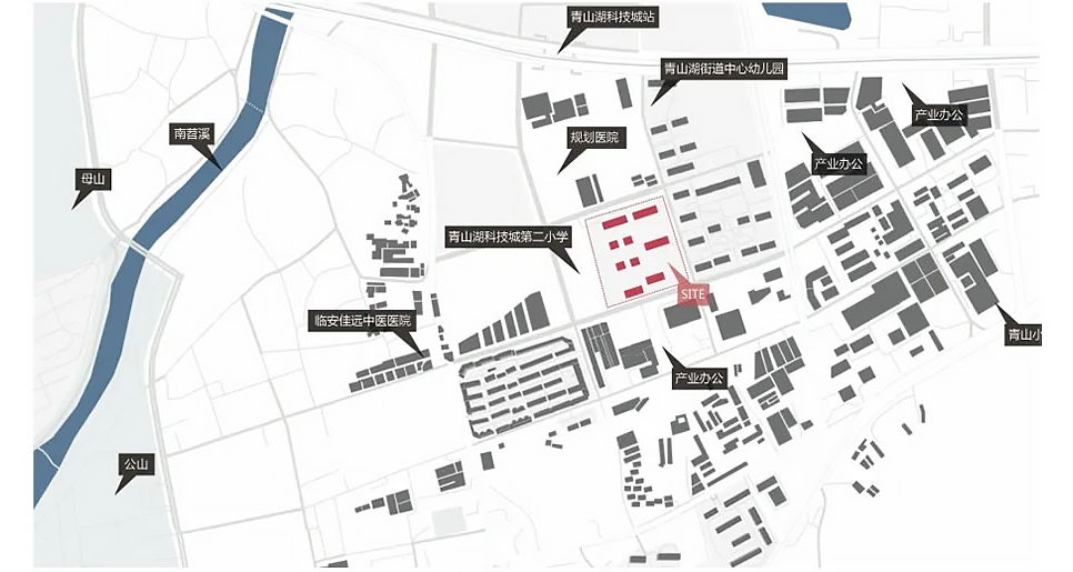 Azure plot is located in Qingshanhu science and Technology City in the west of Hangzhou City, 400m away from the rail transit station, 2.7km away from Qingshanhu Park, and 16km away from Hangzhou West Railway Station. The site is surrounded by offices, schools, hospitals and other supporting functions, and nantiaoxi meanders to it. Landscape, industry and supporting facilities jointly weave a potential industry city integrated area, which also brings many possibilities for the living mode created by the project.