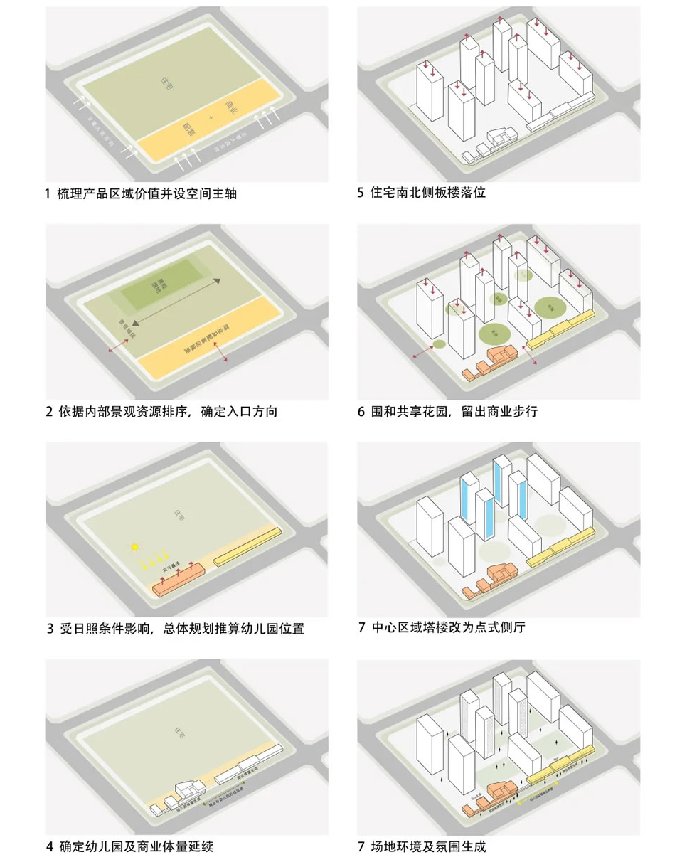 与周边复合多样的区域底色相对的,则是周边地块对日照的严格限制:为了避免对北侧医院、西侧学校、南侧未建住宅以及东侧安置房造成遮挡,本地块设计边界条件基本锁定,成为设计师实现空间叙事与表现理念的无形桎梏。于受限的条件中“戴着镣铐起舞”,在受制约的可能性里“螺蛳壳里做道场”,设计师针对天阳蔚蓝的解题思路是找寻逻辑严谨的理性推论与美好空间理念之间的平衡。