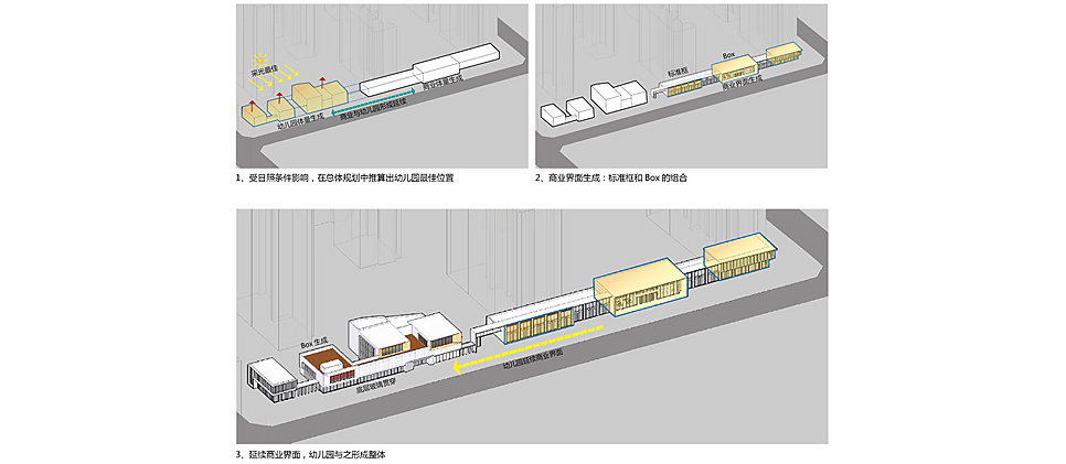 Kindergartens tend to have a negative effect on the vitality of the city. In the blue project, designers try to continue the vitality of the whole business district in a more positive way, using glass walls combined with entrances and exits to give people a sense of closeness. Compared with the traditional wall interface, to a certain extent, the activity scene inside the kindergarten is extended, and the colorful and highly scattered aluminum boxes also make the kindergarten more interesting, People who walk in the street feel different fireworks.
