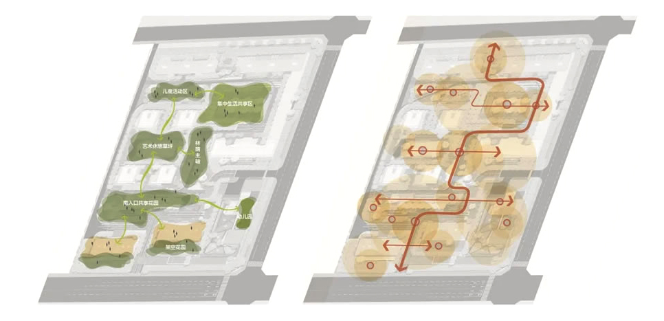As the core of the large community, Tianyang azure not only activates the urban interface outside the fence, but also realizes the inward penetration of community vitality through spatial means. The increase in vitality stems from the growth of spontaneous and social activities.